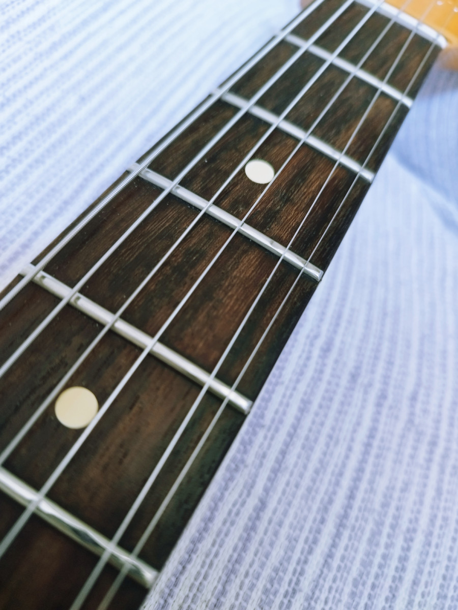 -Mástil en C de arce y diapasón en palisandro 12" con 21 trastes medium jumbo. Inlays en marfil.