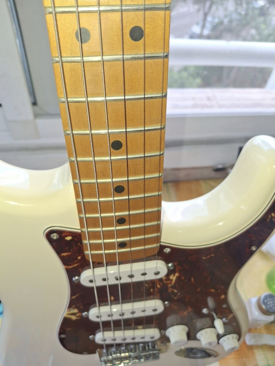 Para vender mi favorita mexicana de mas alta gama, color Arctic white, pero con tiempo esta mas crema, cuerpo de aliso, mástil y diazapon de arce canadez, PATILLAS TEXAS SPECIALS 3x SSS.CON funda de fender semi rigida alcochonada deluxe.