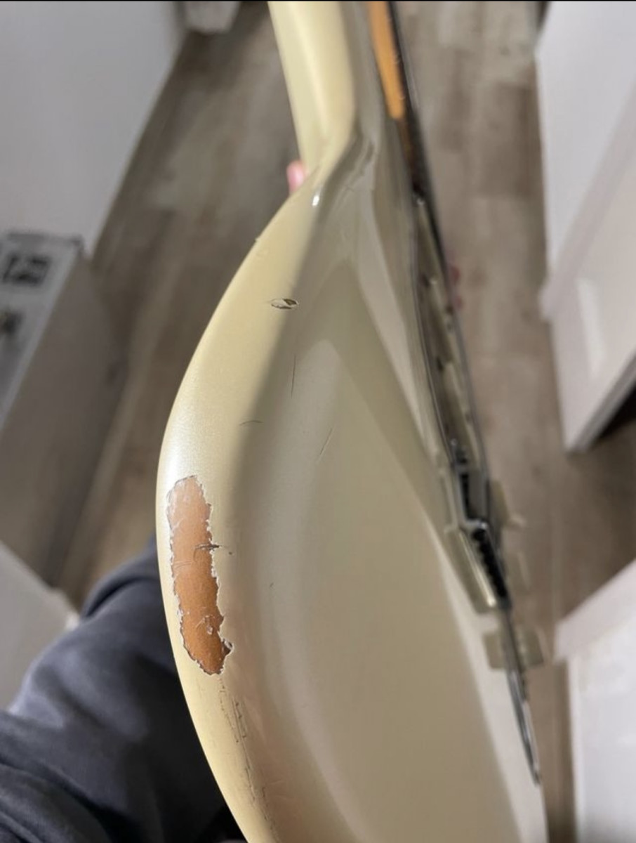 Sin ningun golpe, los rasguños son los que salen en la foto, solo afectan estéticamente, ya que la guitarra está como nueva. Tapa de los muelles incluida en el mismo tortoise rojo que el golpeador, palanca y hard case incluidas. Acepto ofertas.