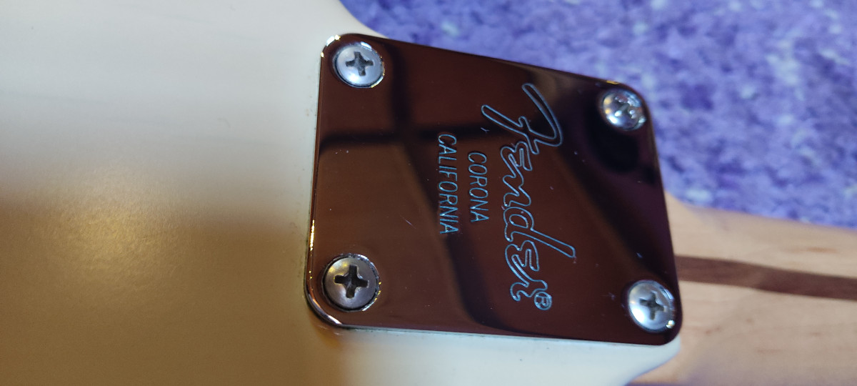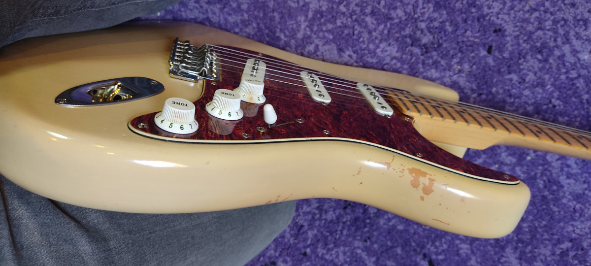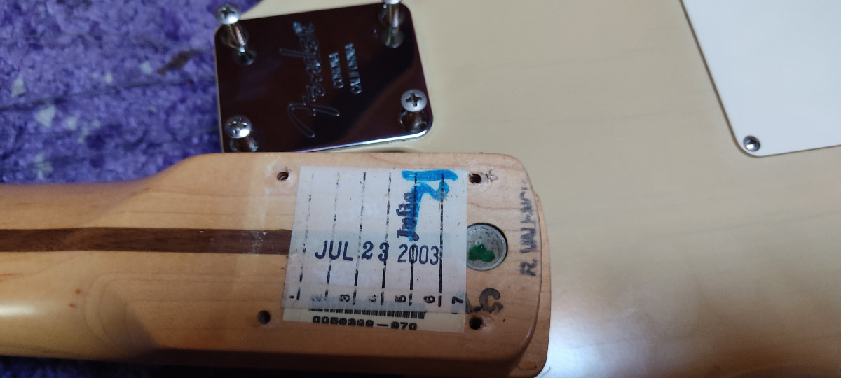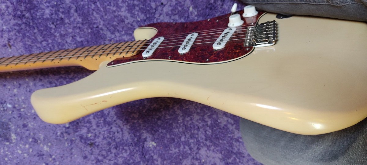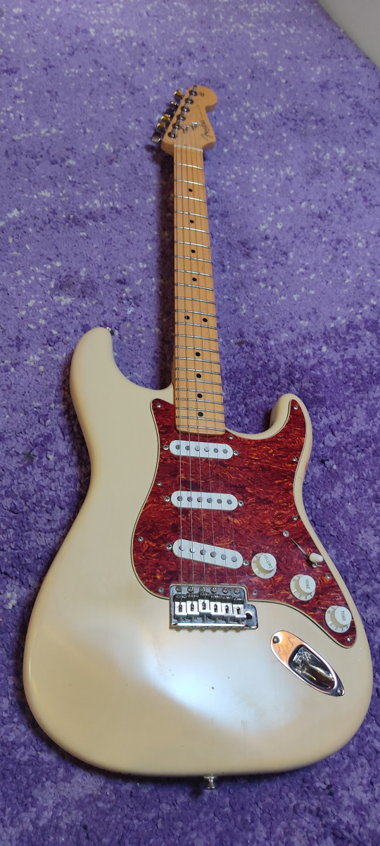 Fender Highway One Stratocaster. Acabado Honey Blonde y construida en 2003 en Corona, California. Relicado natural debido a su acabado de laca delgada Highway One Honey Blonde. Pastillas de Strato de Bobina Única de Estilo Vintage con Piezas de Polo Escalonadas, Imanes Alnico.
