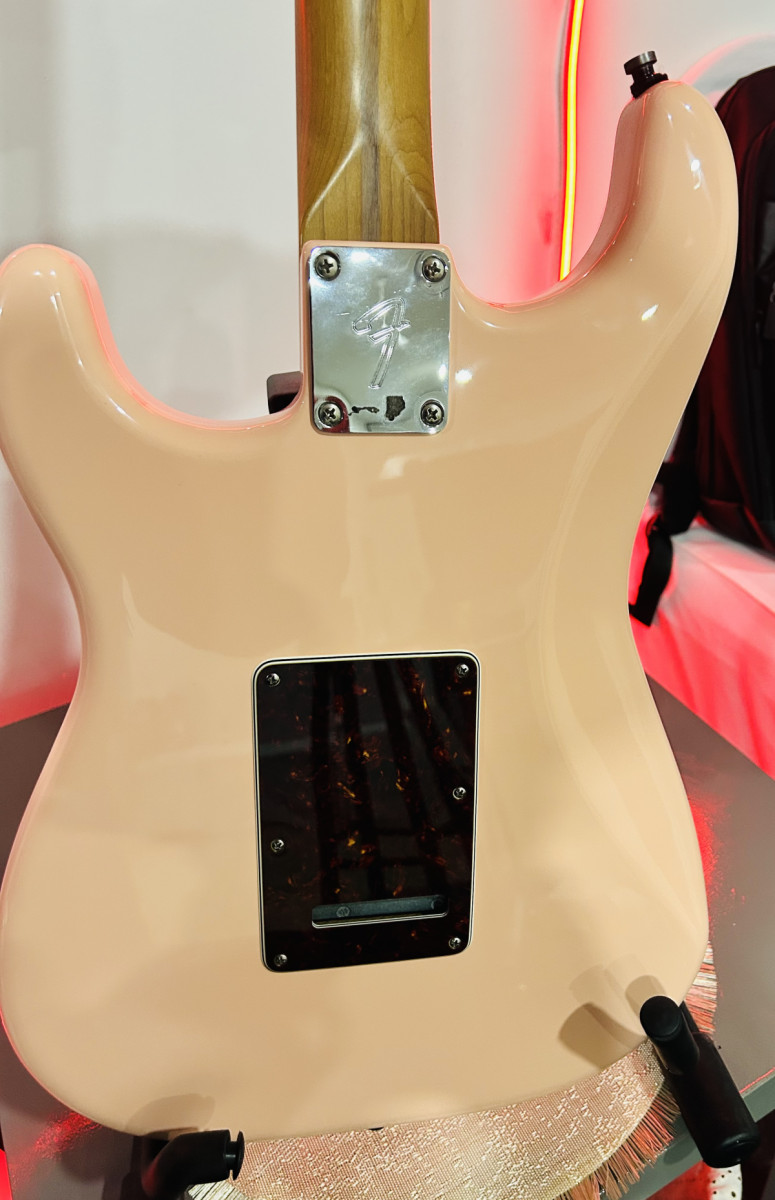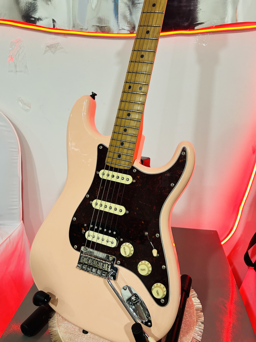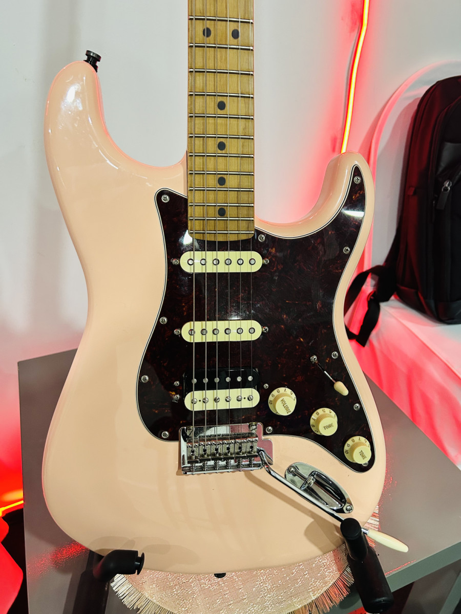 Características mas destacables: color shell pink, mástil de arce tostado, radio 9,5, perfil C moderna y confinguración pastillas HSS.