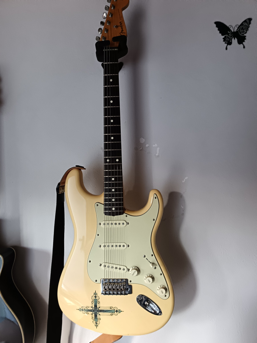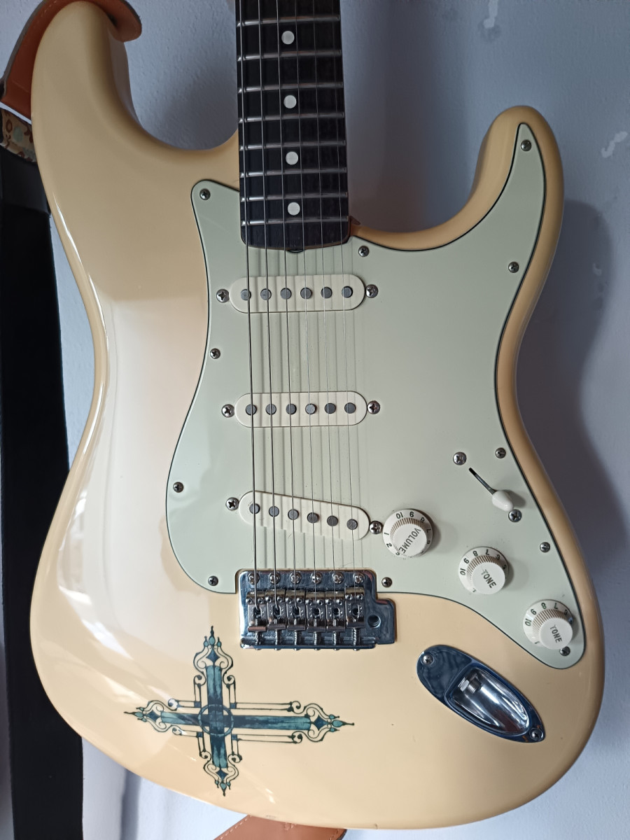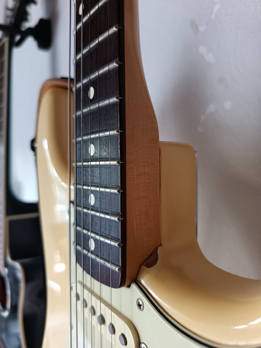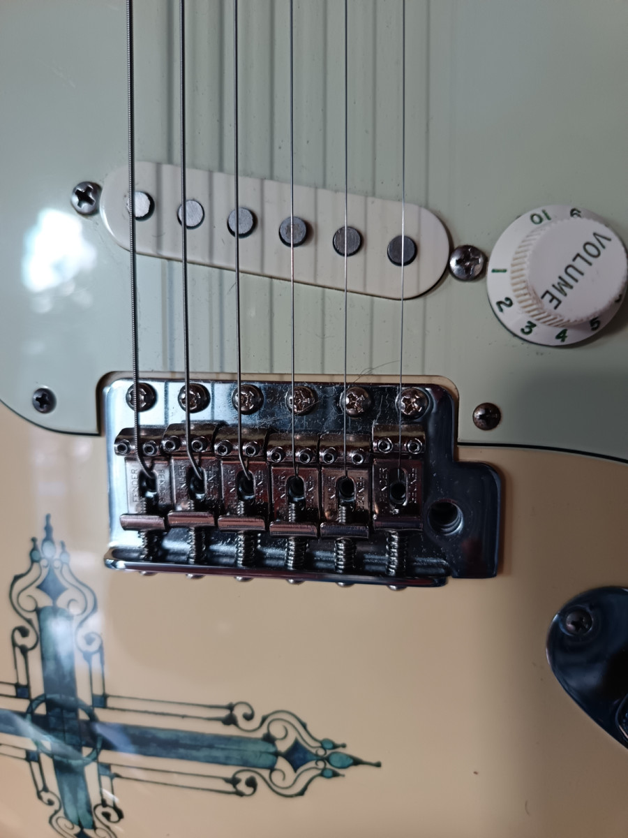 - Cambiado el puente por un Fender Vintage ya que el que montaba originalmente era demasiado ancho quedando la primera y sexta cuerdas demasiado en el borde del traste.