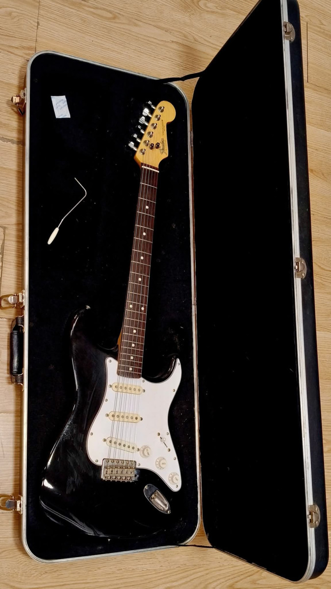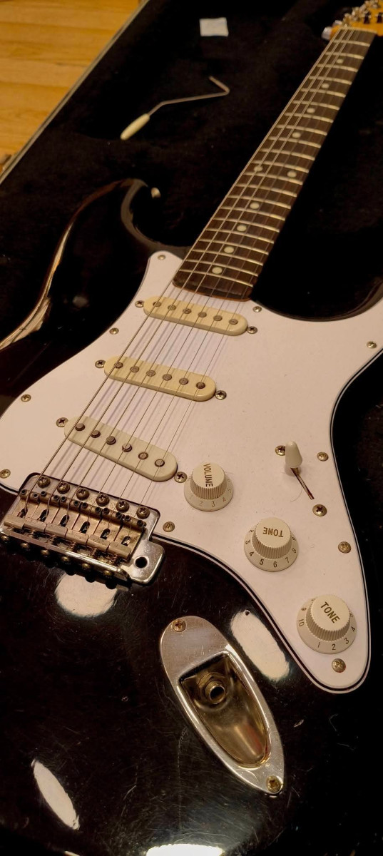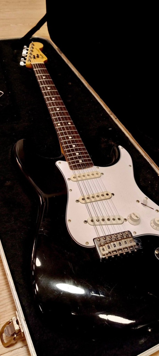 Vendo mi vieja Fender Stratocaster negra con golpeador en blanco y pastillas american standard.