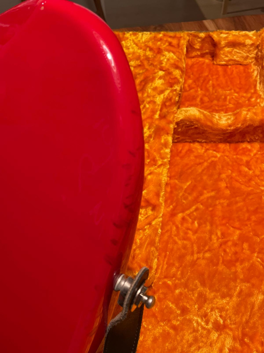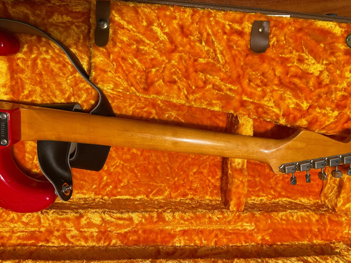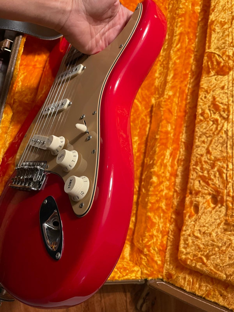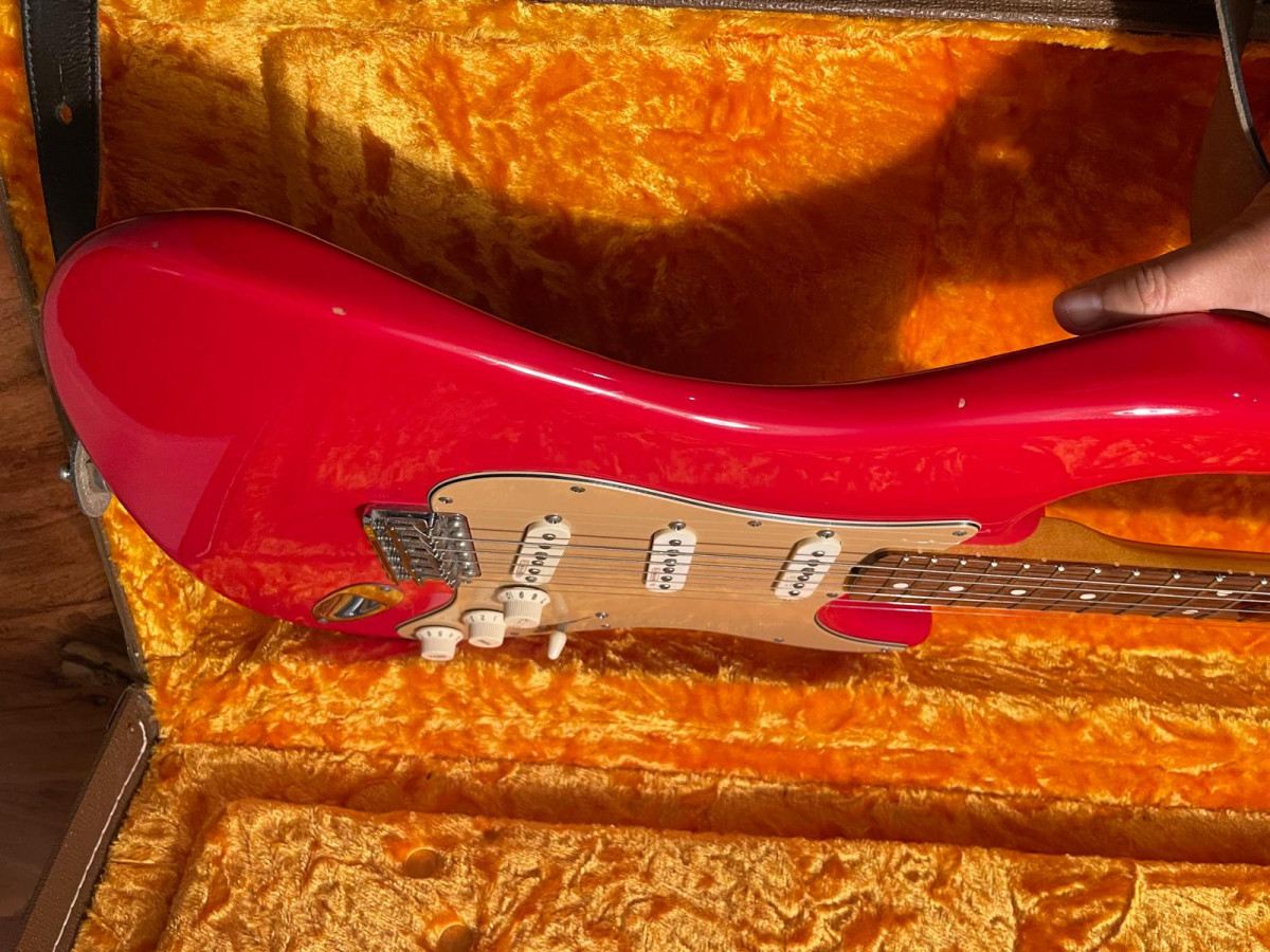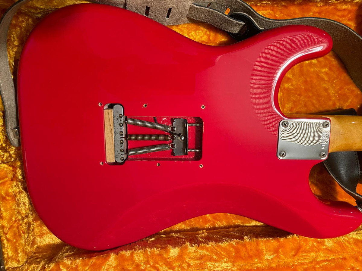 Pongo a la venta esta Fender Stratocaster Mark Knopfler Signature original de 2003, fabricada en USA. Acabado Hot Rod Red con golpeador vintage (el original), mástil de arce y diapasón de palorrosa. Viene con su estuche original G&G tipo vintage en perfecto estado. Estado de trastes 9,5/10, nunca retrasteada
