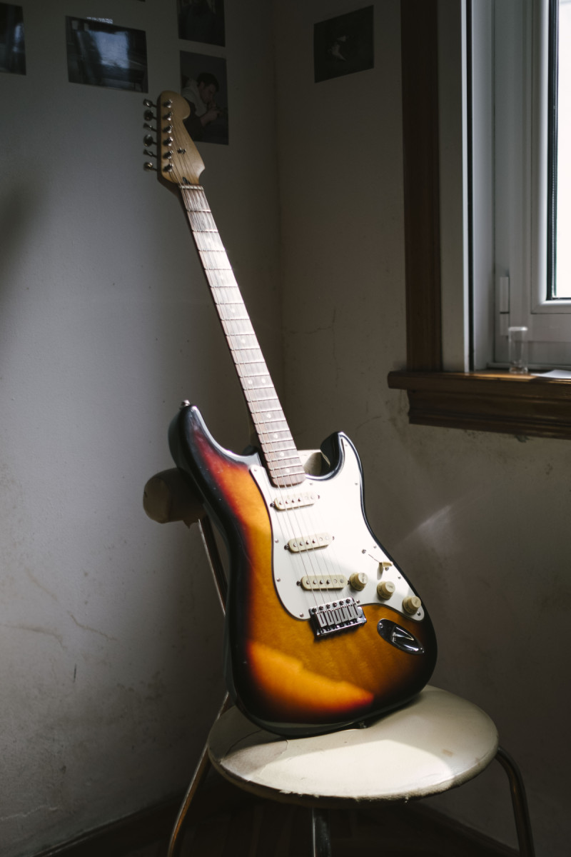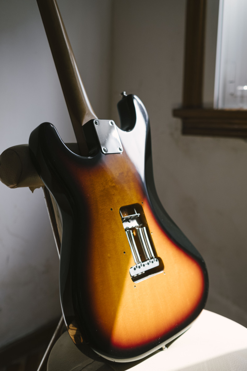 Buen estado general, con una reparación hecha por luthier en la pala, a causa de una grieta, pero nunca me ha dado problema, la madera y la estética me parece mucho mejor que las actuales, de sonido es cañera y mas grave que una actual, incluye maleta y trémolo.