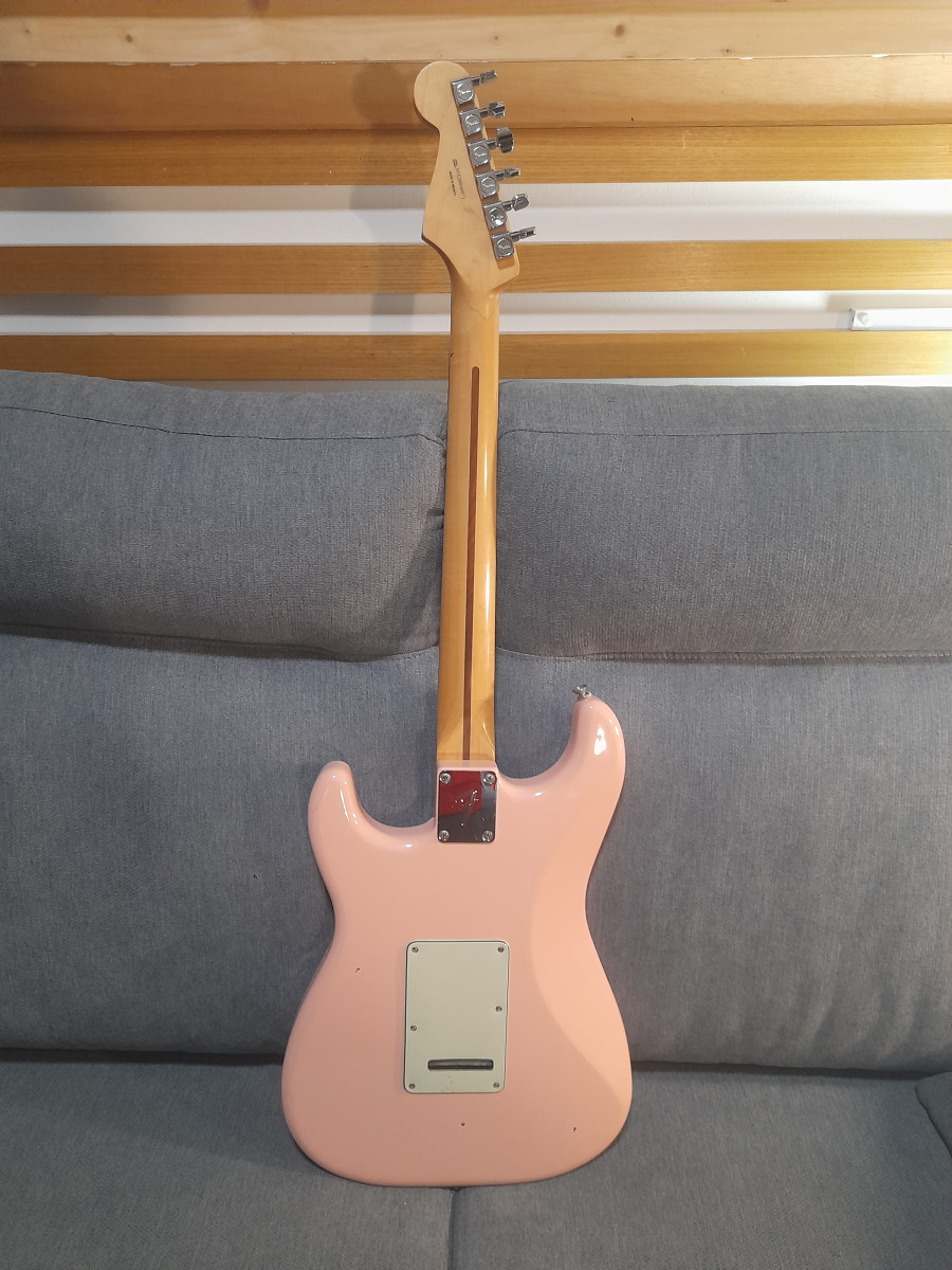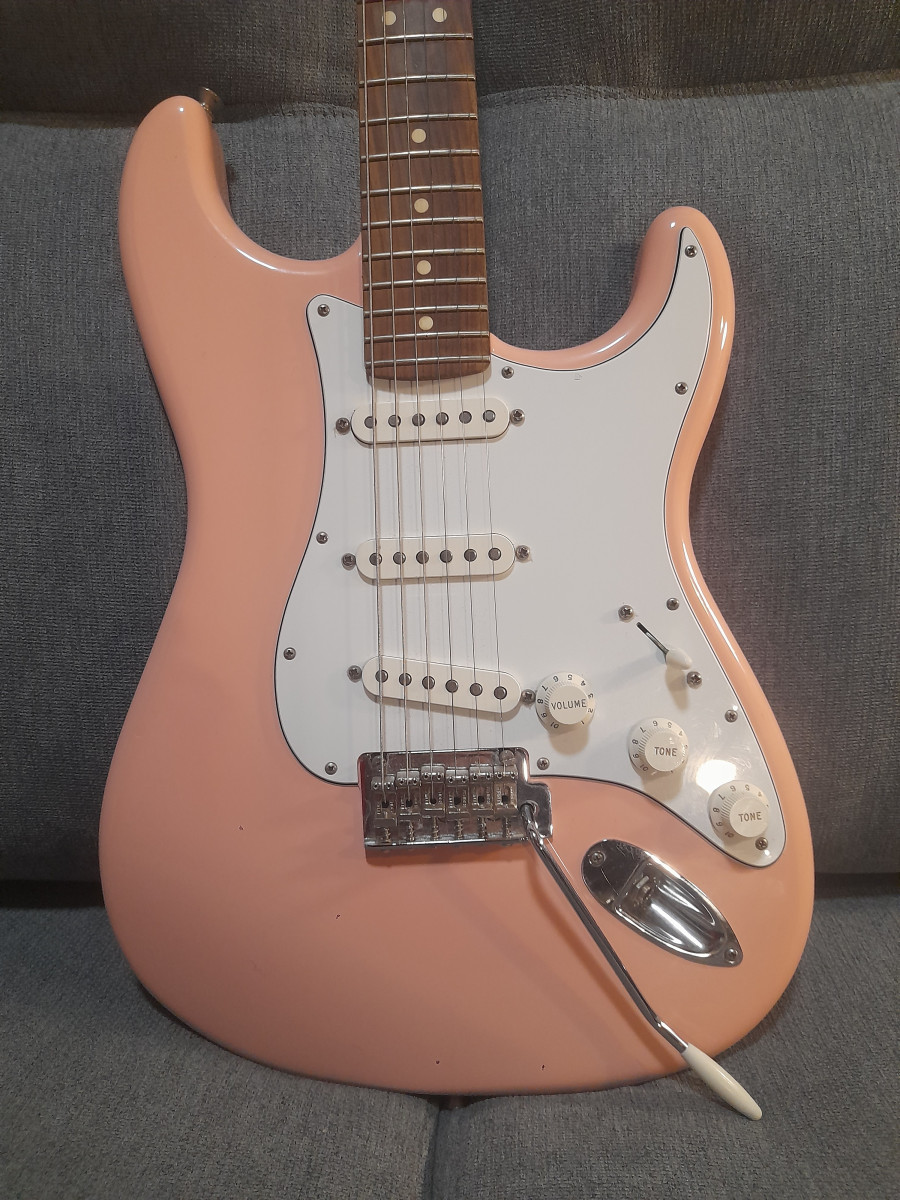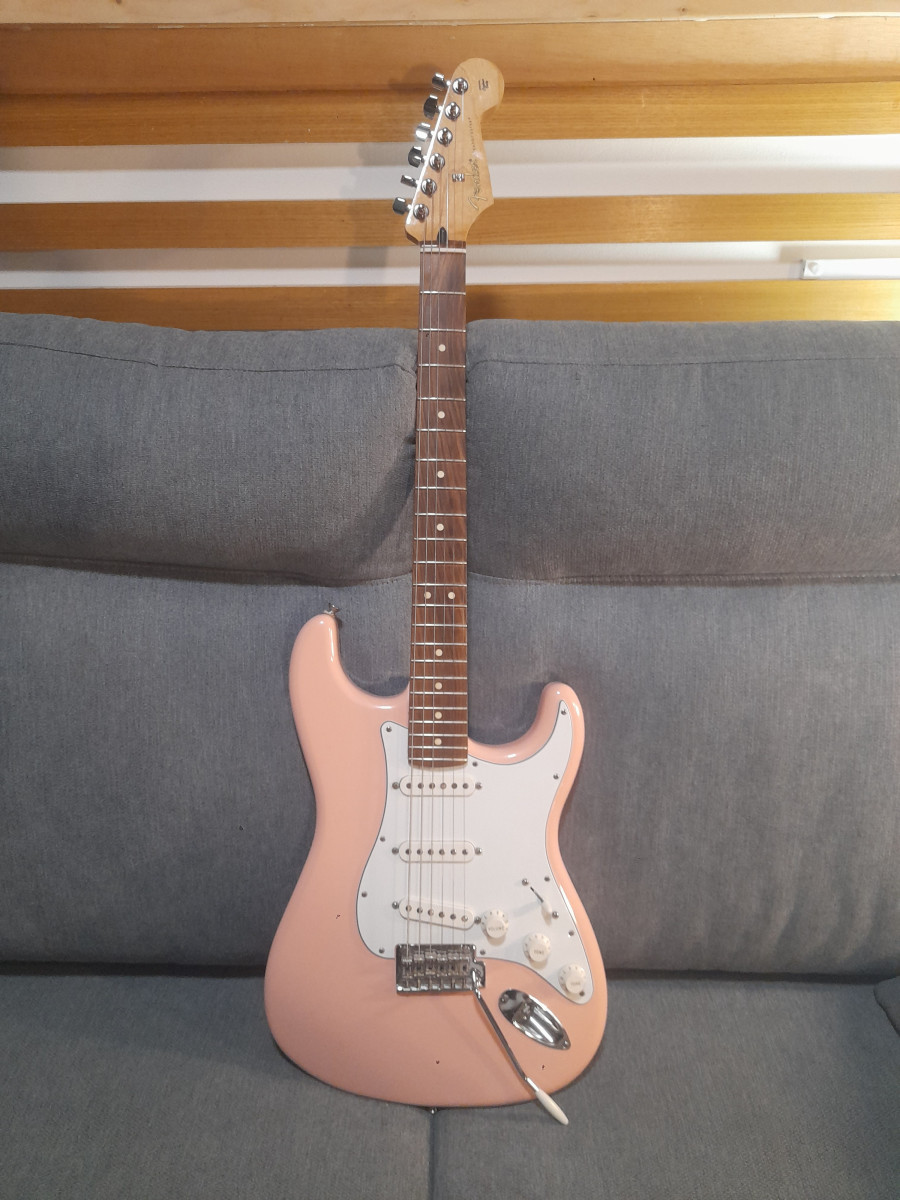 Preciosa guitarra Fender Stratocaster fabricada en México. Tiene un hermoso acabado rosa pálido. Prefiero venta en mano porque tiene algunos toquecitos muy difíciles de sacar en foto.