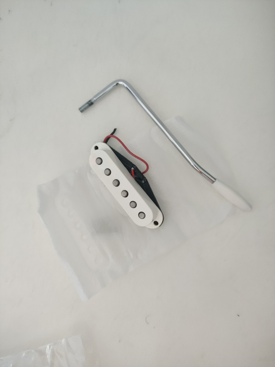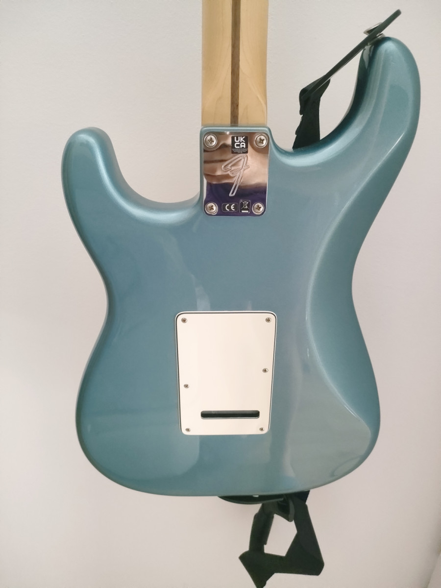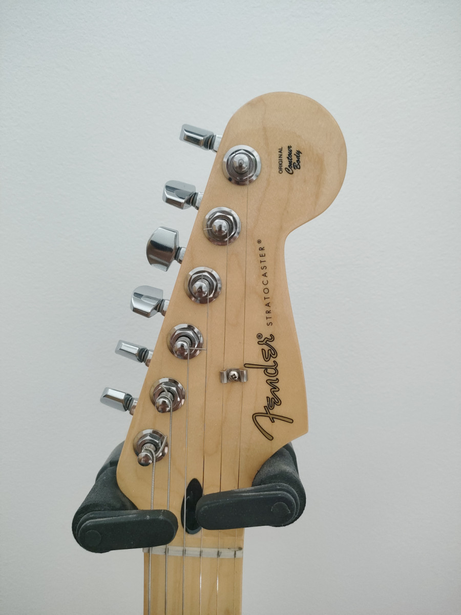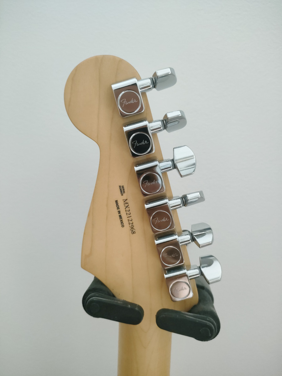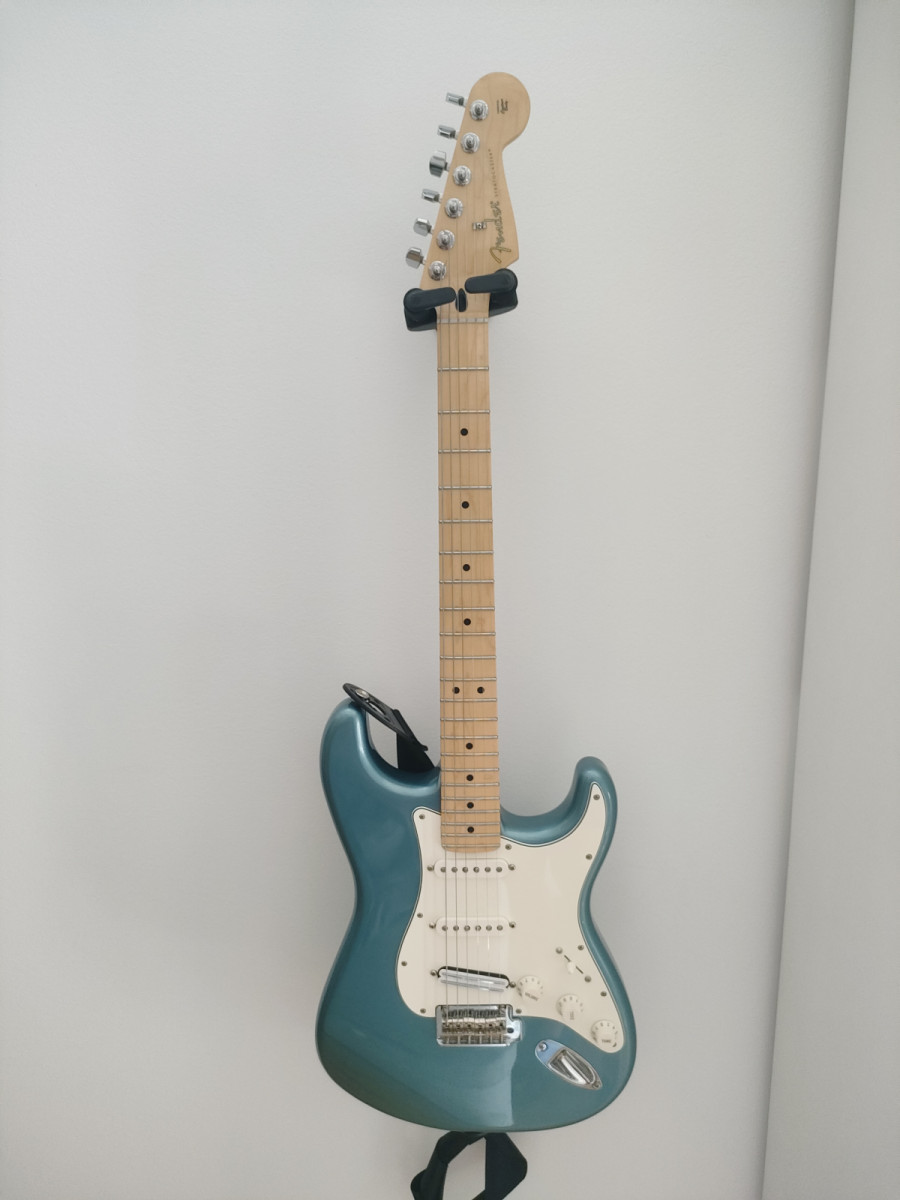 Guitarra Fender Player Stratocaster, fabricada en México. Está en muy estado. Se cambió la pastilla del puente por una estilo hambucker todo hecho por luthier y mantiene la pastilla original.