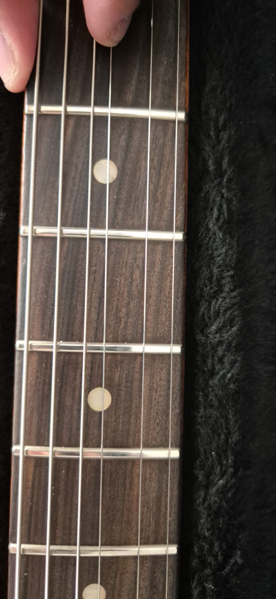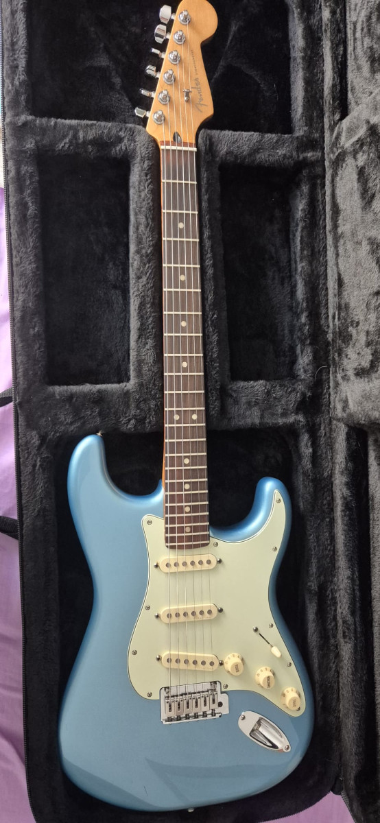 Hace un par de meses pasó por el taller del luthier Alejandro Ramírez (o3 Guitars), donde se le hizo un ajuste completo, pulido de trastes y cambio del jack. Además, he cambiado los afinadores por un juego nuevo idéntico al original, así como la tornillería del puente (todo recambio original fender) ya que tenían desperfectos estéticos (algo de óxido) y quería dejarla impecable para la venta. Por lo demás, todo en la guitarra es original de fábrica (aunque como digo, realmente sigue siendo original al 100% ya que tanto los afinadores como la tornillería es original fender). Desde entonces, ha estado en su funda.