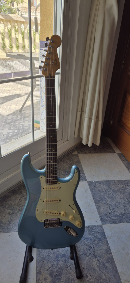 Hace apenas unos días pasó por el taller del luthier Alejandro Ramírez (o3 Guitars), donde se le hizo un ajuste completo, pulido de trastes y cambio del jack. Además, he cambiado los afinadores por un juego nuevo idéntico al original, así como la tornillería del puente (todo recambio original fender) ya que tenían desperfectos estéticos (algo de óxido) y quería dejarla impecable para la venta. Por lo demás, todo en la guitarra es original de fábrica (aunque como digo, realmente sigue siendo original al 100% ya que tanto los afinadores como la tornillería es original fender)