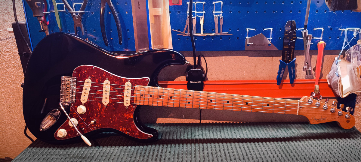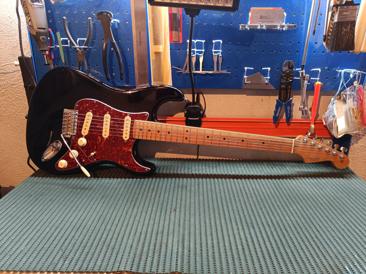 Guitarra Fender Stratocaster Professional en estupendo estado. Es de color negro con un acabado brillante.