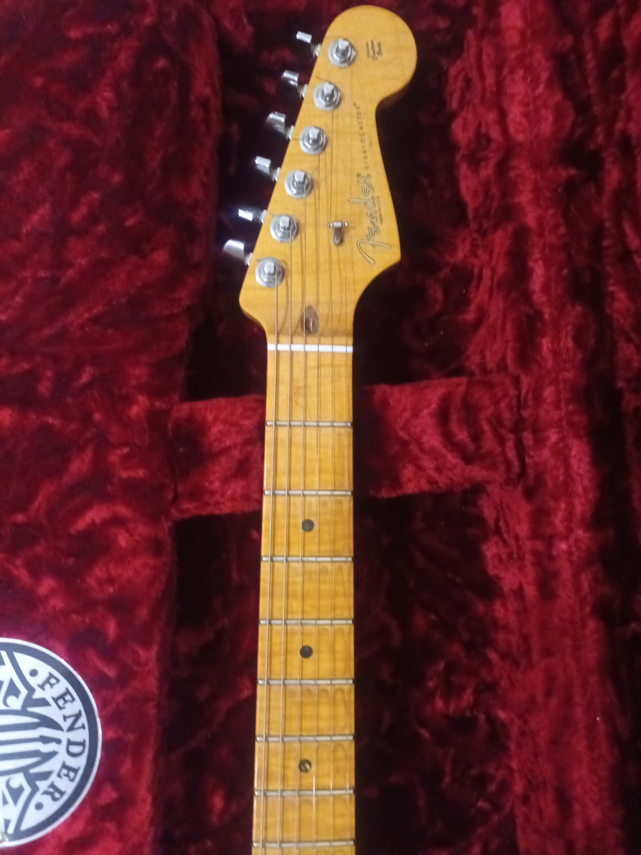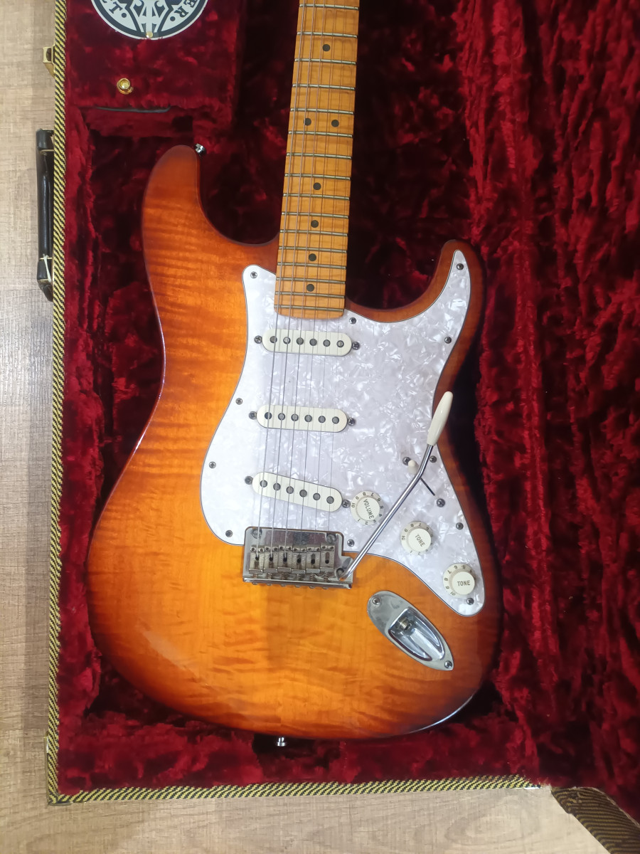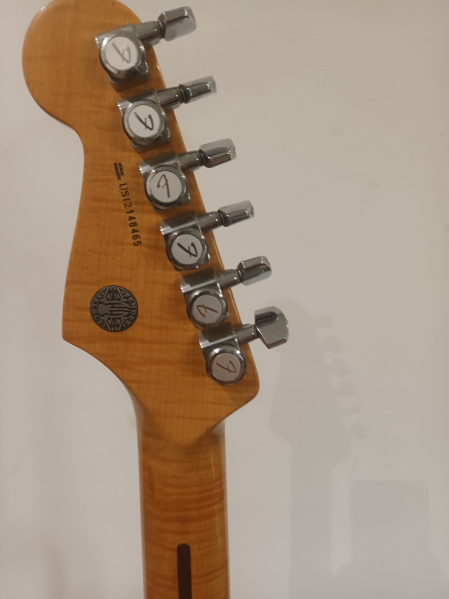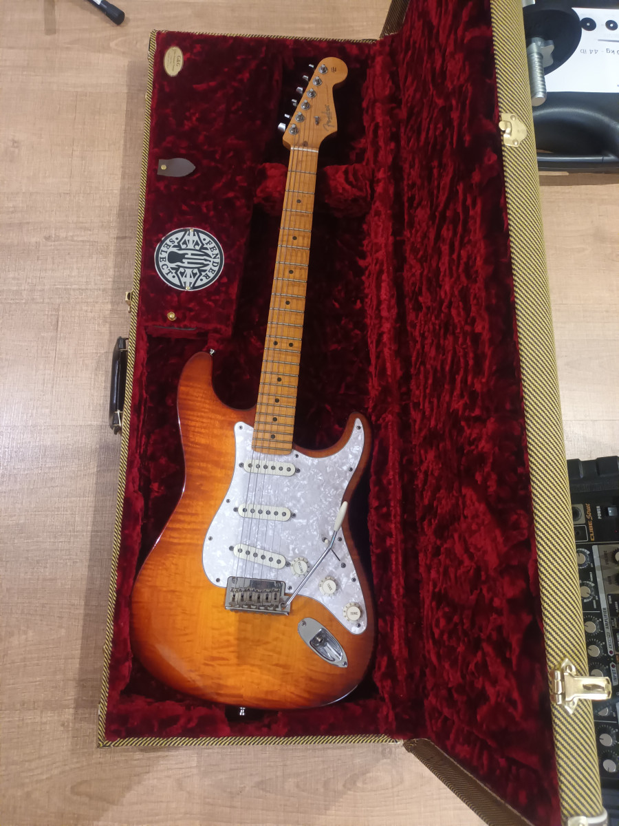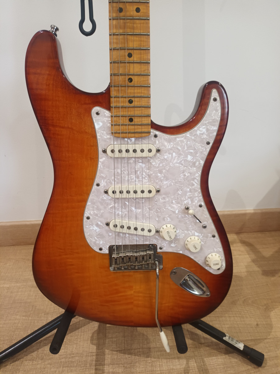 Vendo esta fender american stratocaster burst, importada de u.s.a, con su estuche original y sus cosas, pegatina, garantía, correa fender nueva, etc, perfecto estado, golpeador cambiado al de comunión pearl, bloqueadores de afinación tapa de arce y mástil de maple flammed.