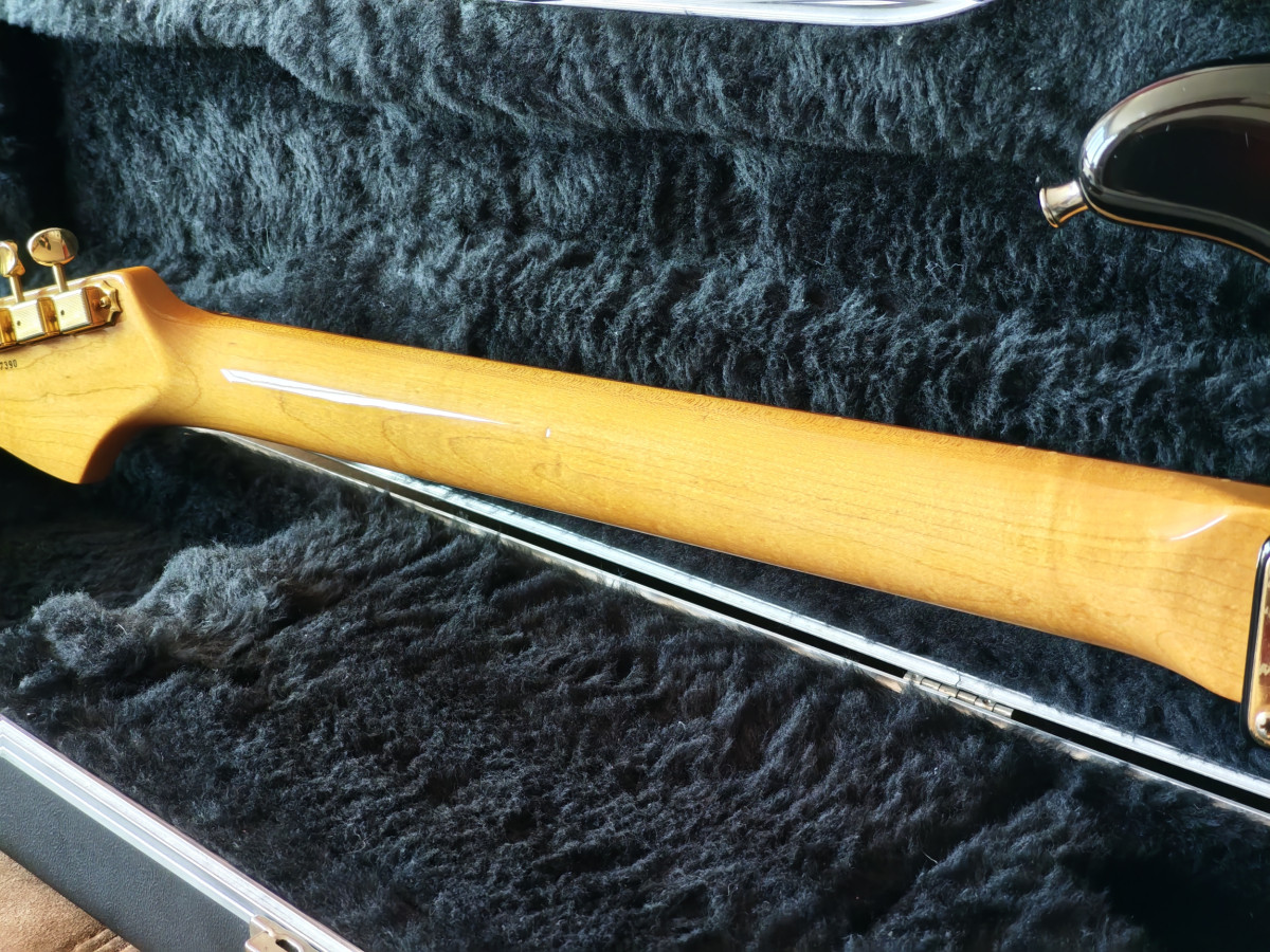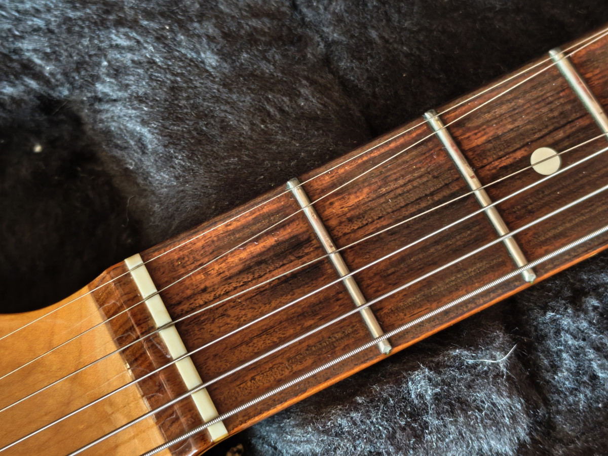 El estado estético diría que es excelente salvo por una marca en la parte trasera del mástil que solo afecta a la laca, y algún arañazo superficial en el cuerpo solo visible con determinada luz. También presente leve desgaste en los dorados, puente y chapa trasera, algo bastante común en este tipo de acabado. Los trastes se encuentran en buen estado y solo los primeros muestra algunas marcas típicas del uso. Como peculiaridad este guitarra tiene originalmente radio 12" que la hace muy cómoda para bendings y el puente se encuentra invertido, tal y como lo llevaba SRV en su icónica guitarra.