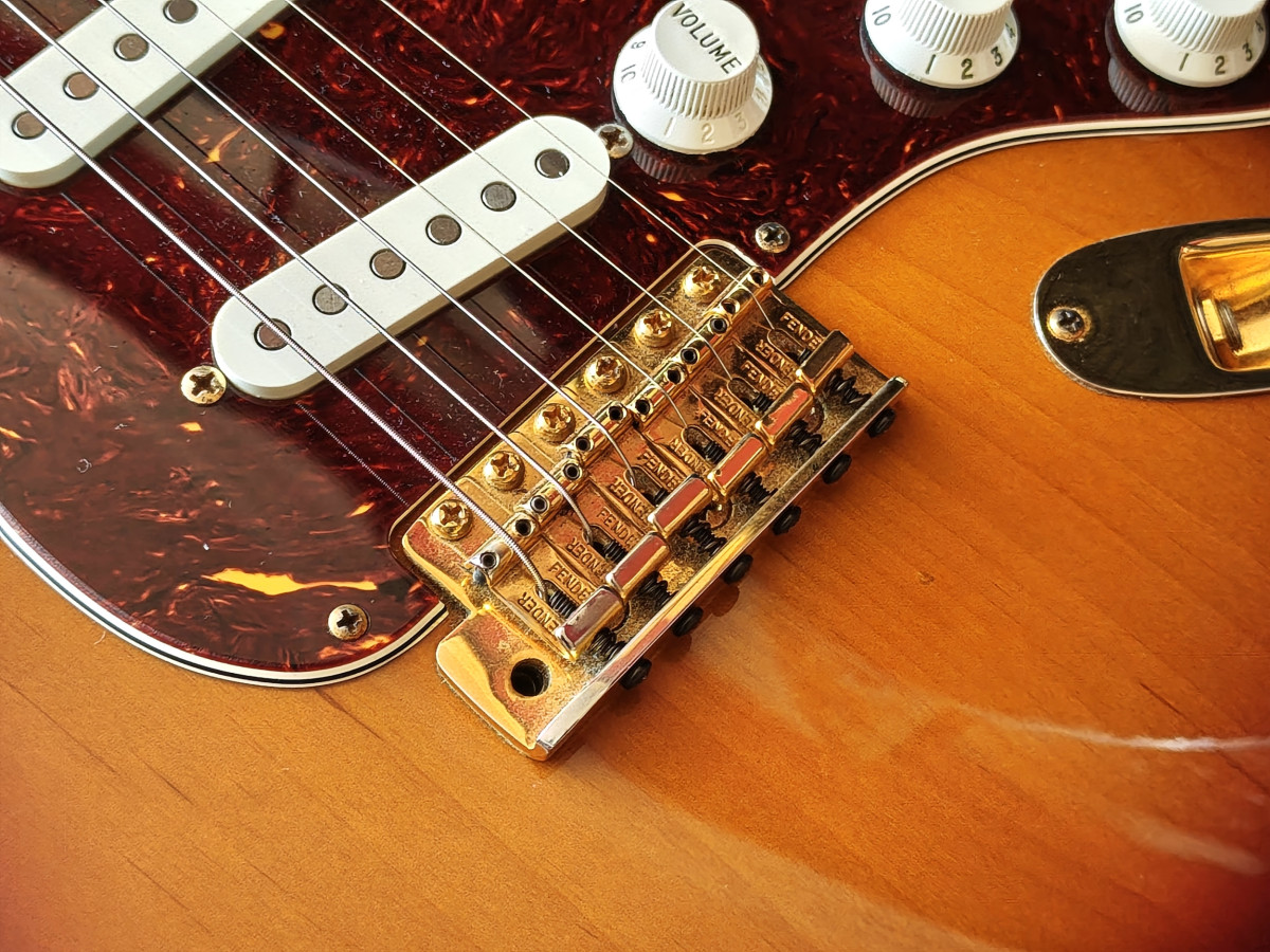 La guitarra es toda original, solo se ha modificado el golpeador por uno tortoise y mejorado las pastillas por unas Lollar blackface, que son unas pastillas boutique valoradas en unos 300€ y que proporcionan el tono Strat 60's pre CBS con imanes de Alnico, 5 planos con bobinado disperso y bañadas en cera. No conservo las pastillas y golpeador originales.