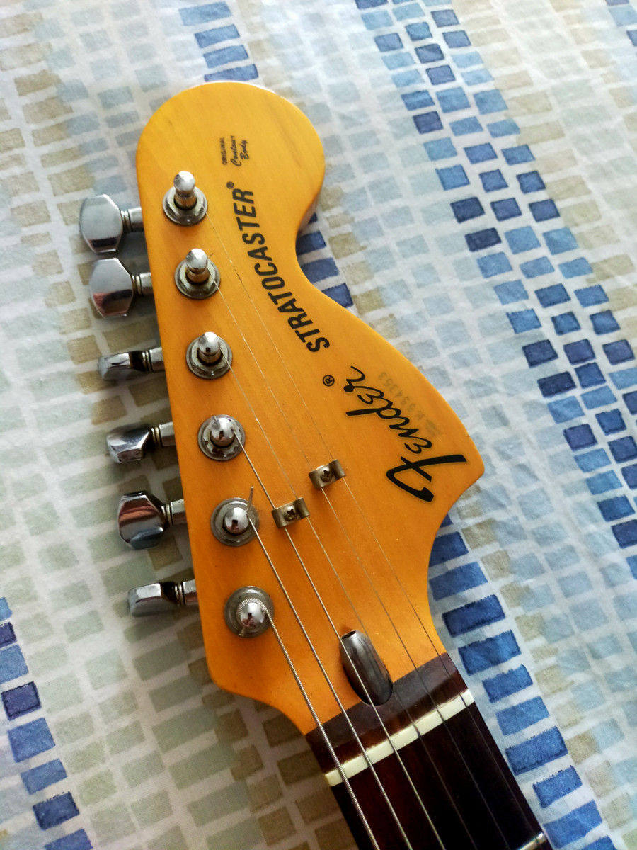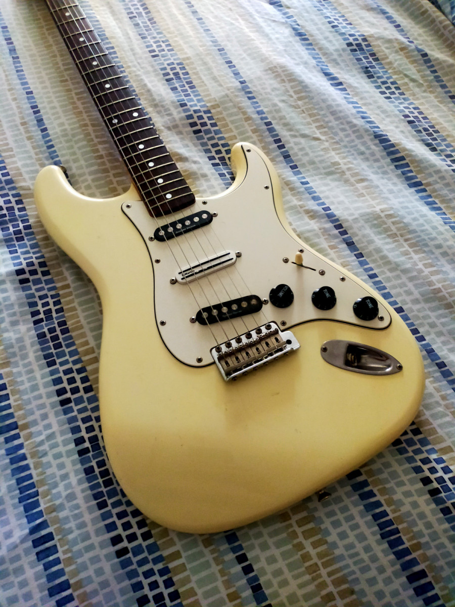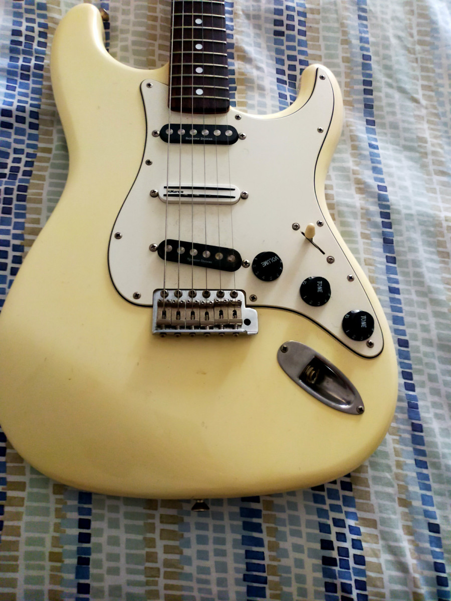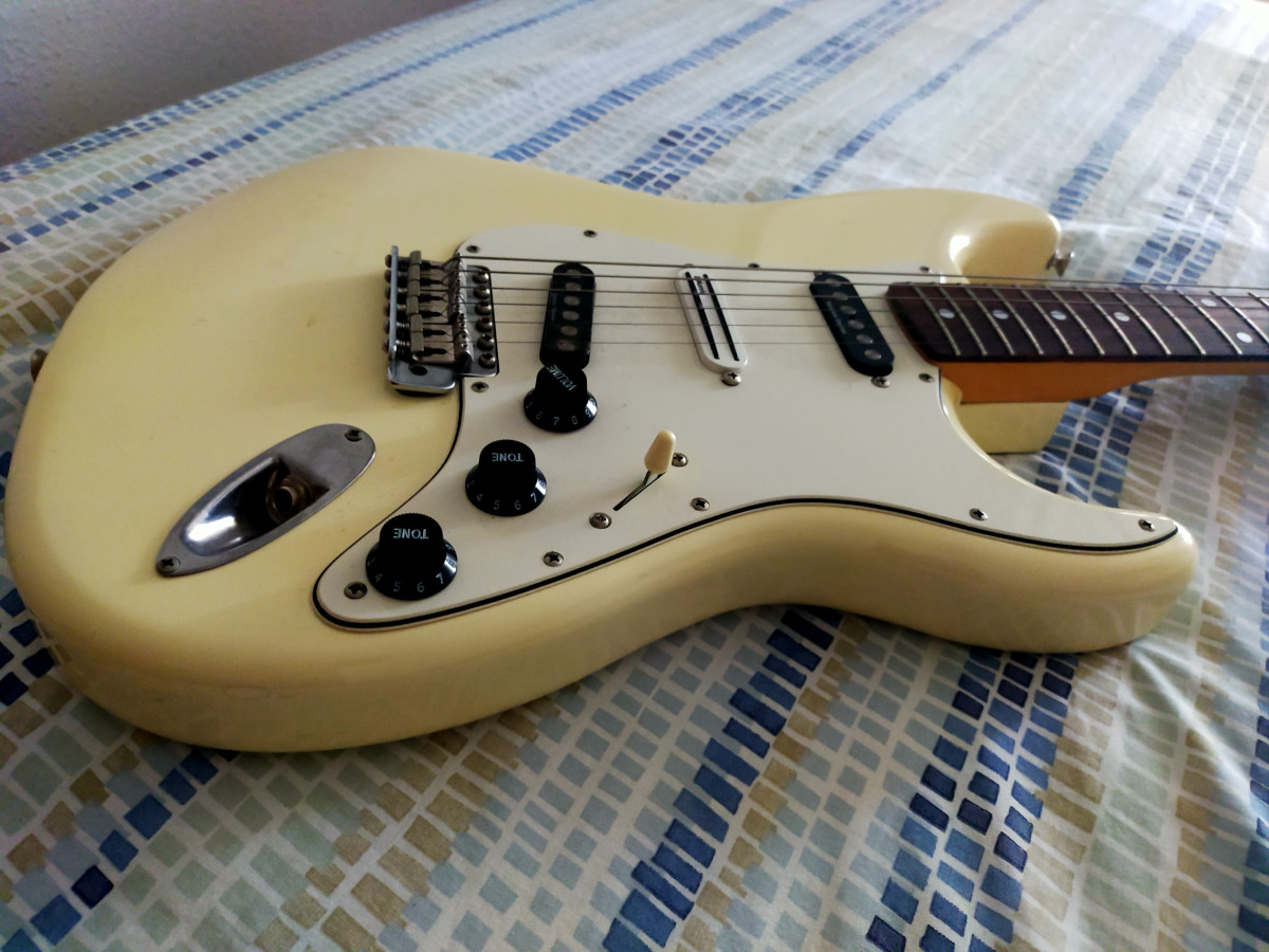Fender stratocaster made in japan de los 80. Serie E de las mas prestigiosas salida de la factoría japonesa. Pastillas quarter pound en puente y mastil y hot rail en el medio. Estuche de la epoca que encaja la forma al milímetro. Para unico cambio voy tras una Sg no faded no negra.