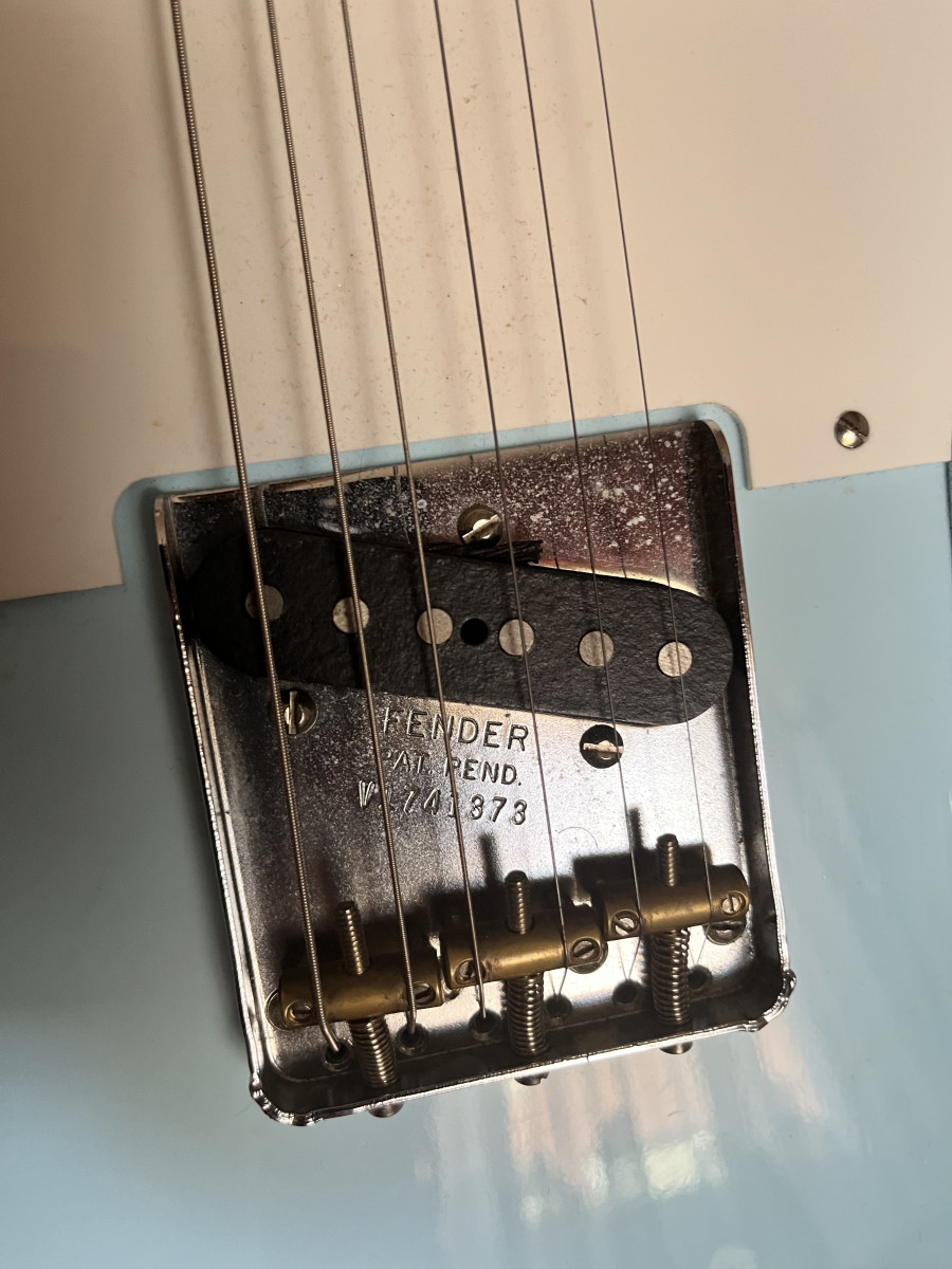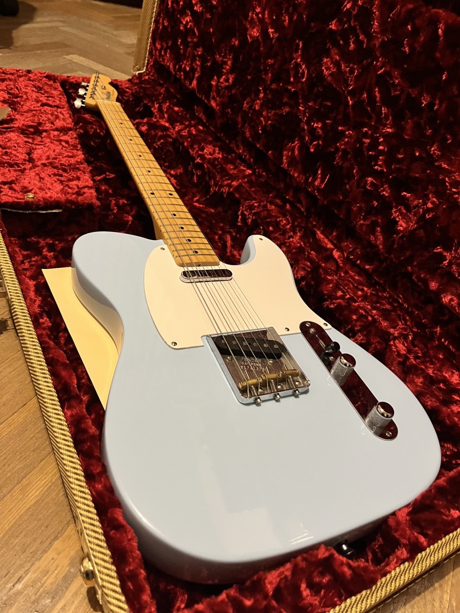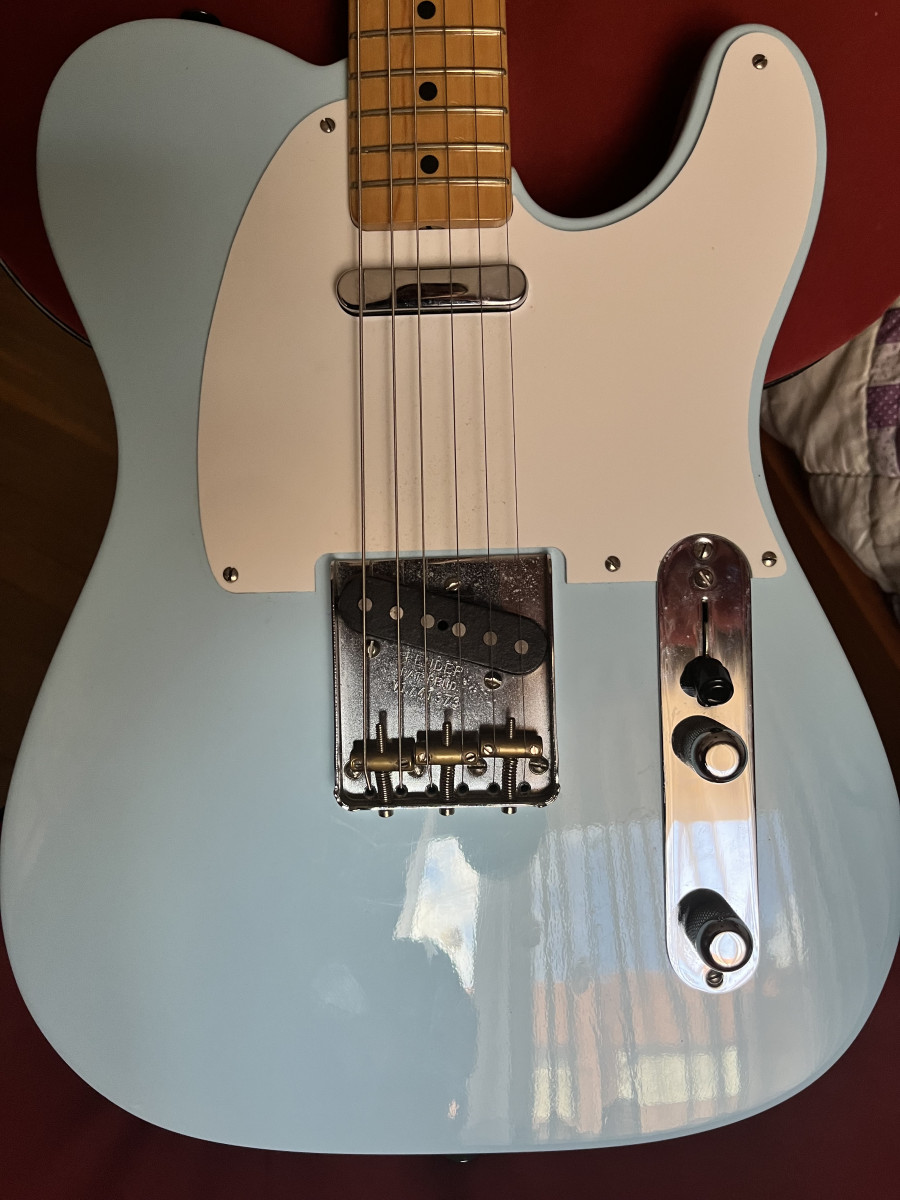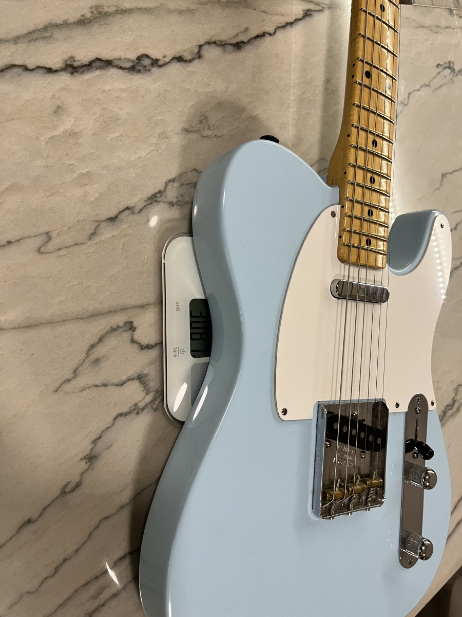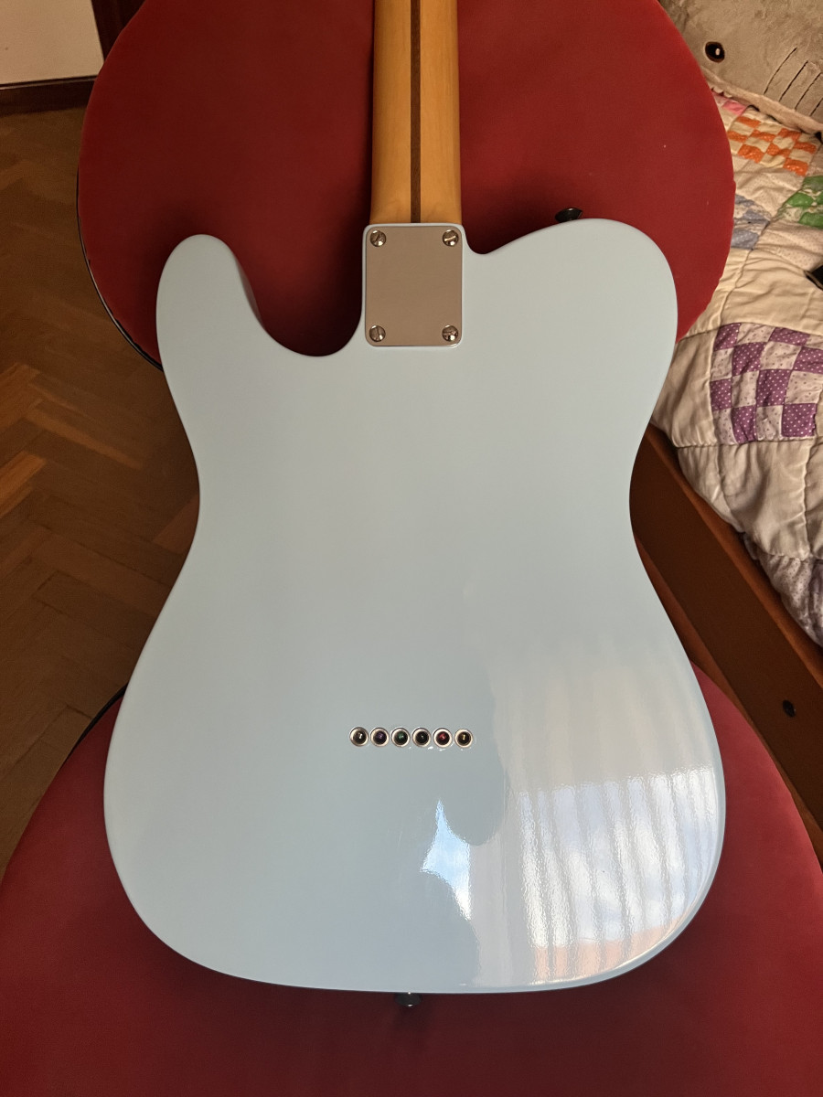 Repintada en Sonic Blue, nitrocelulosa. Perfecta. Acción baja y sonidazo. Con estuche tweed y papeles. Peso: 3,081 kgs. Es muy ligera y sin enchufar ya tiene un volumen considerable.