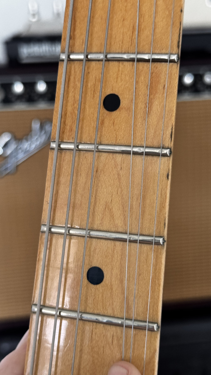Los trastes tienen algunas marcas (ver fotos) pero no afectan al tocar, hacer bendings ni provocan trasteo. Aún tienen mucha vida por delante. Con funda Fender blanda.