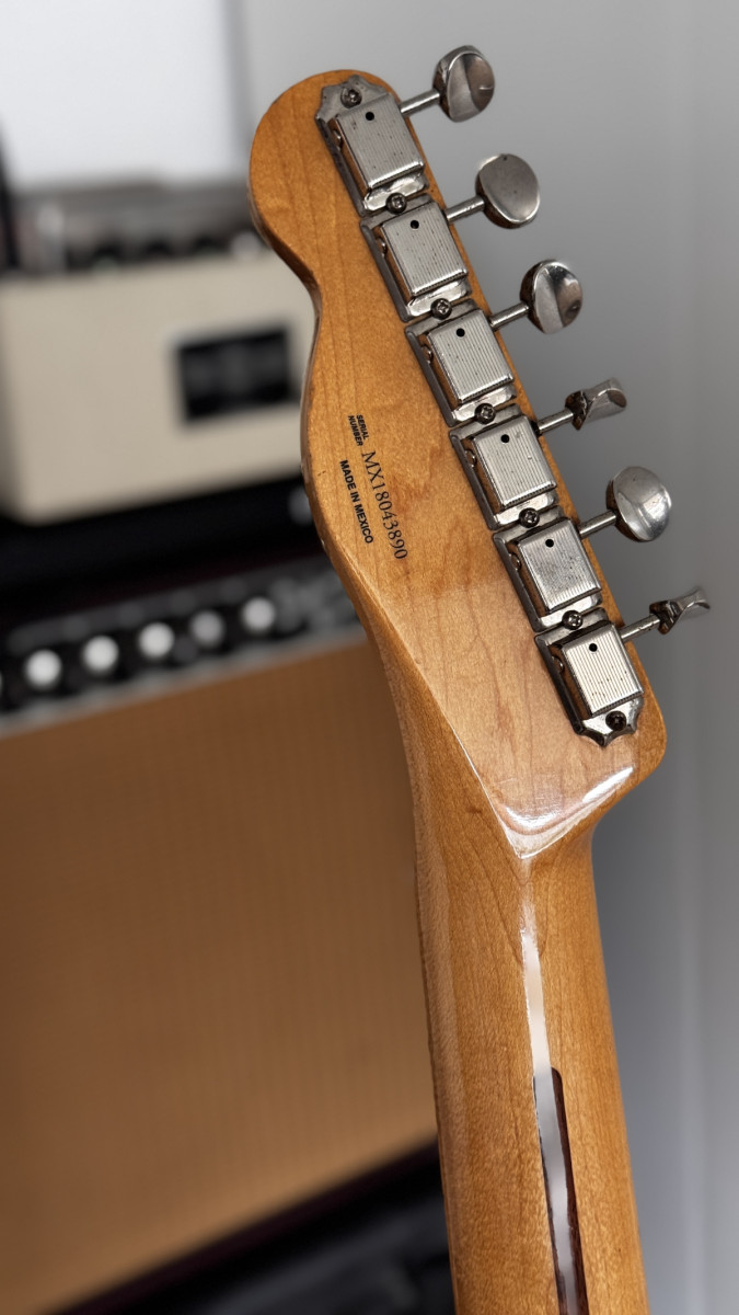 Fender Telecaster BAJA, seguramente si estas aqui ya conoces las especificaciones. Diseñada por Custom Shop y hecha en Mexico, mástil grueso estilo ‘52, radio de 9,5", selector de 4 posiciones con 6 sonidos (2 de ellos fuera de fase, buena versatilidad). Twisted Tele en el mástil (sonidos tipo Strat) y Broadcaster en el puente.
