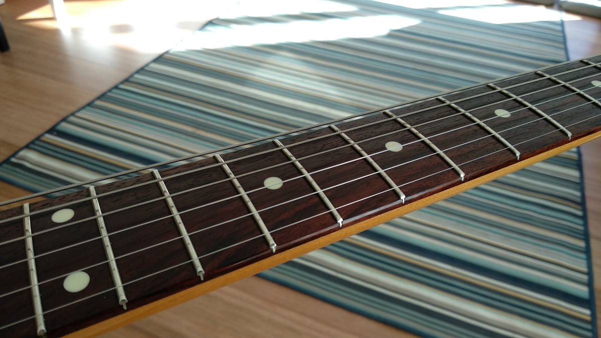 - Mástil con perfil “C” (ni fino ni gordo), radio de 7.25 y trastes vintage (a pesar del radio, se toca y se siente cómodo).