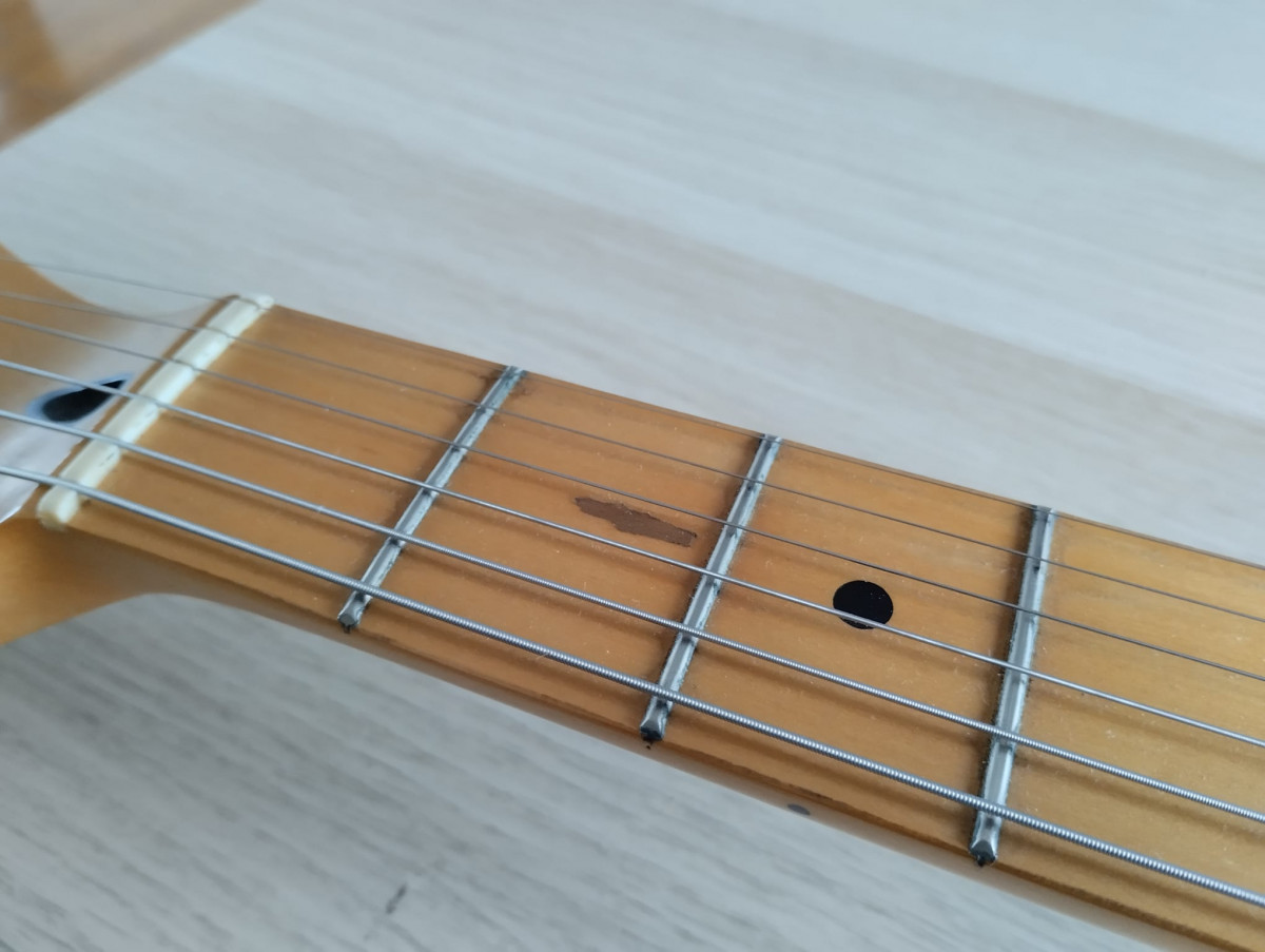 Está en muy bien estado, apenas tiene marcas de uso, solo en el diapasón junto al segundo traste ha perdido algo del acabado, por lo demás ni un golpe ni arañazo.