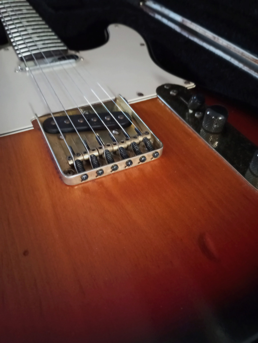 Fender Telecaster Highway One del 2006. La compré en el 2015/16 tal cual está salvo dos cambios: clavijas de afinación (negras por motivos estéticos, para combinar con los potes, logo, etc.) y las selletas con sus respectivos tornillos, de la casa Wilkinson (las antiguas estaban en muy mal estado).