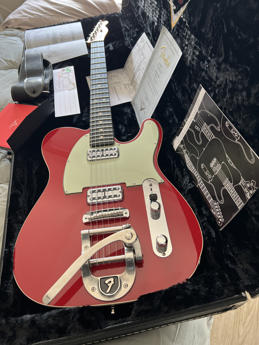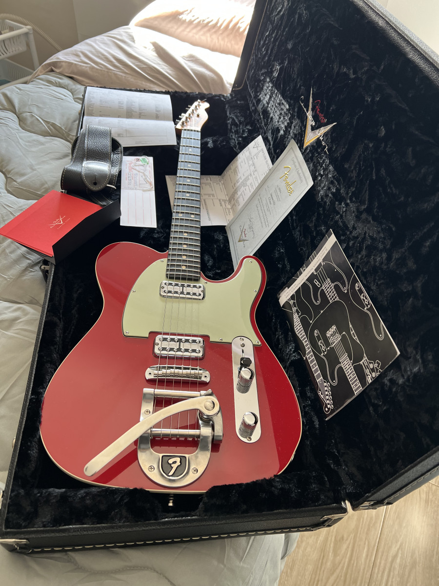 Pues eso vendo mi Telecaster Custom Shop Nos TV Jones Bisby .Color Dacota Red Muy dificil de encontrar en este color.En España..No muy convencido por que es un guitarrón esta COMO NUEVA .Con todos sus papeles y chuches está el de la aduana. Solo tiene echo un cambio los puntos la terales del mastil por unos un poco mas grandes para verse mejor .Peso 4 k. .Sonido espectacular.