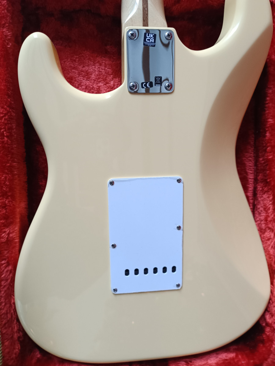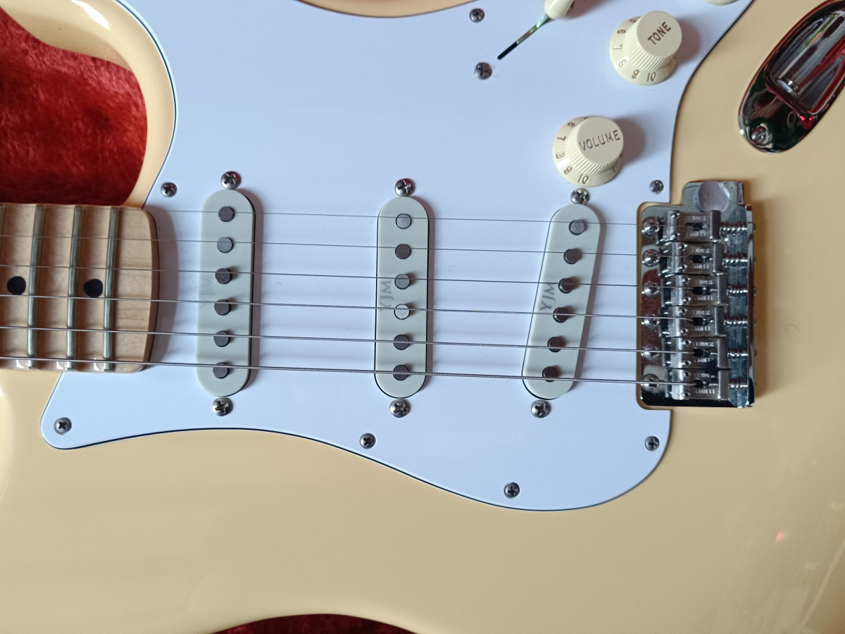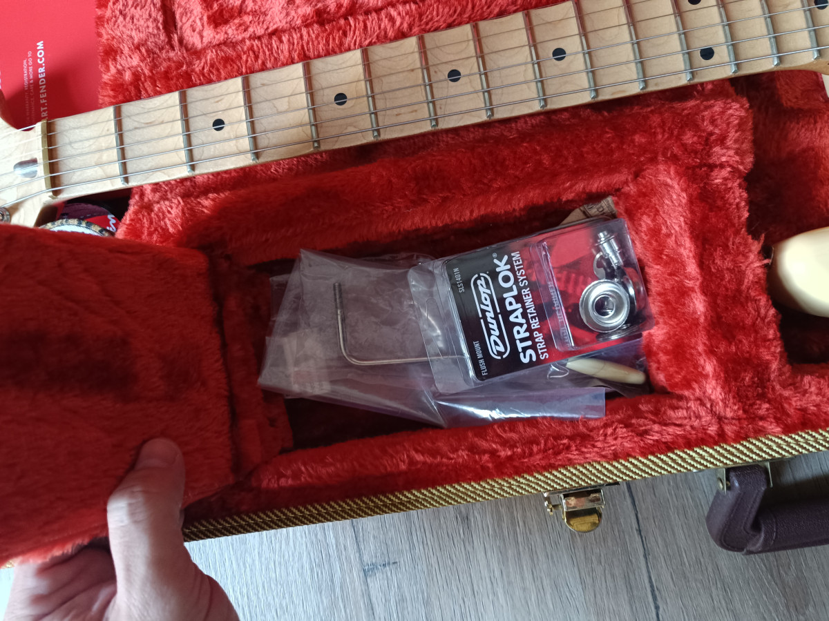 En perfecto estado, con los plásticos todavía puestos, parece a estrenar. Incluye la correa de leopardo, straplock Dunlop, papeles... El estuche no es el original, pero sí es Fender Custom.