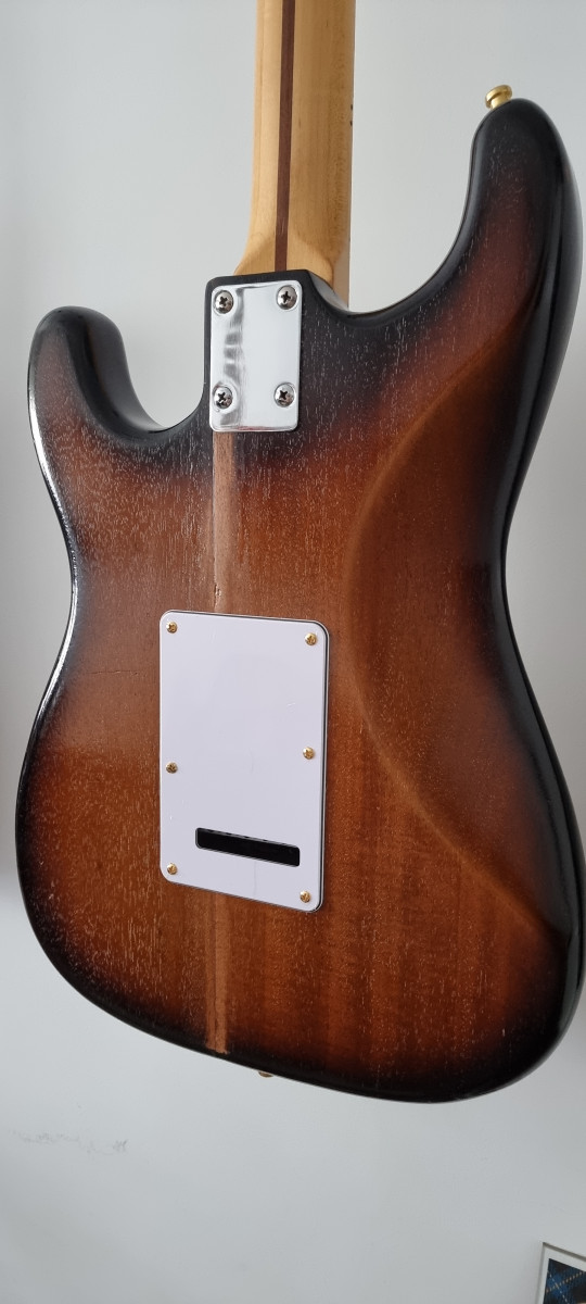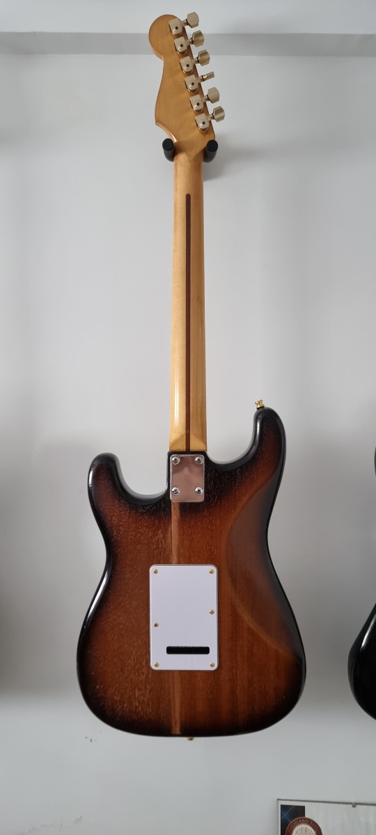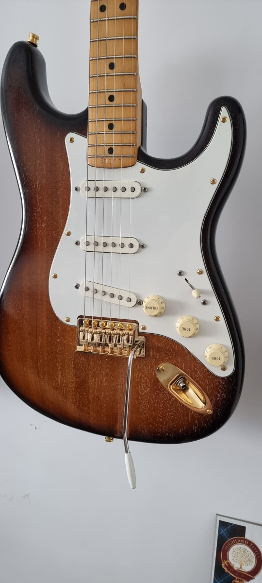 Guitarra eléctrica Fernandes Burny Olds estilo Stratocaster, japonesa de 1975. Presenta un acabado sunburst clásico y herrajes dorados.