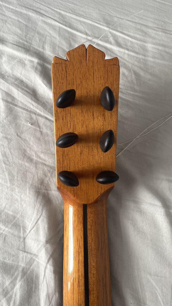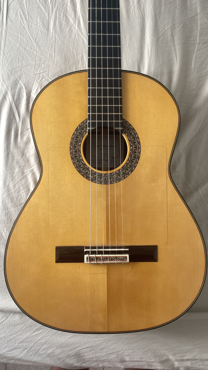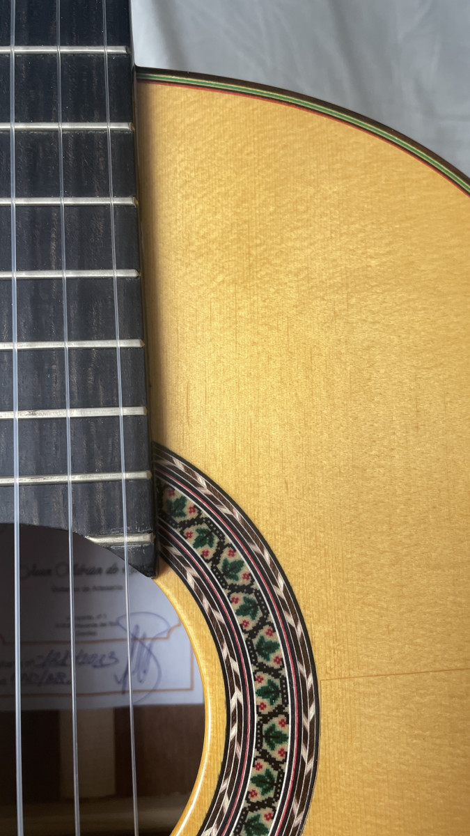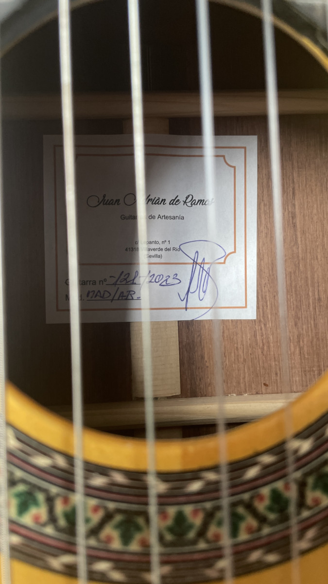 Manuel Ramos es un buen amigo y me construyó esta guitarra específicamente con las indicaciones que le pedí (acción baja, maderas elegidas, palillos mecánicos que afinan a la perfección,... mejor que los mecánicos normales, puente de 12 agujeros) Es un constructor poco conocido pero que hace un trabajo estupendo (muchos compañeros del gremio flamenco tienen sus guitarras) Me mata cuando se entere que la he puesto en venta.