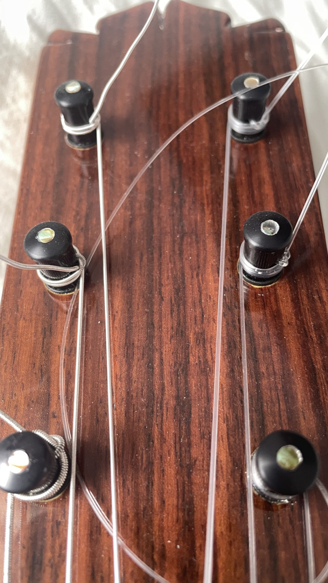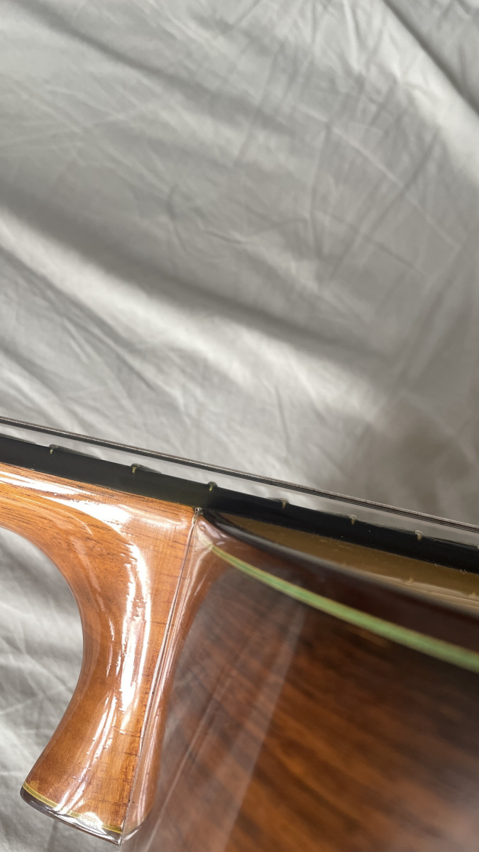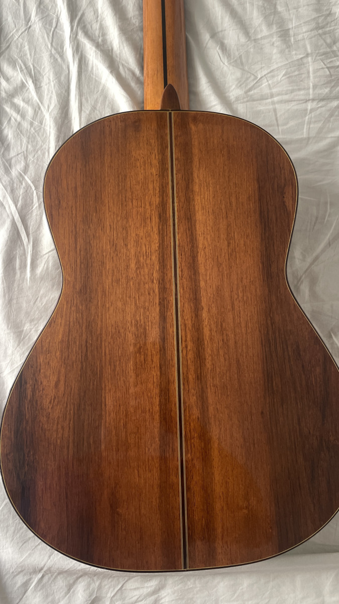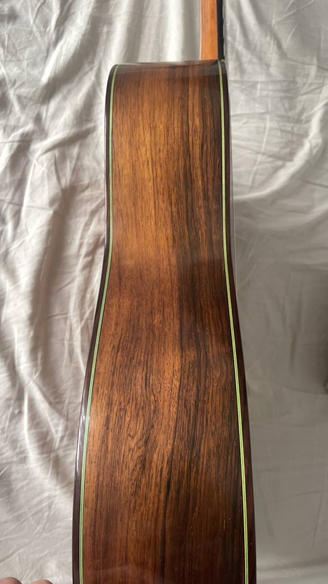 Maderas de primerísima calidad (tapa de pino abeto, fondo y aros de palosanto de madagascar, cedro mástil y ebano diapasón). Barnizado finísimo de poliuretano