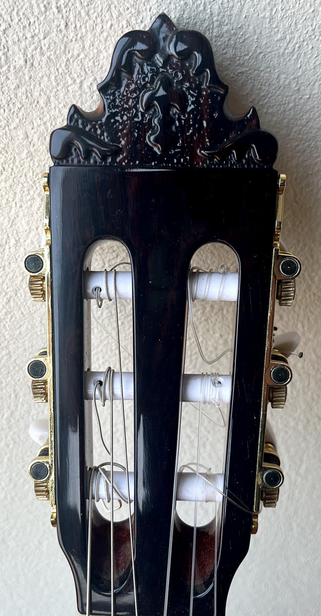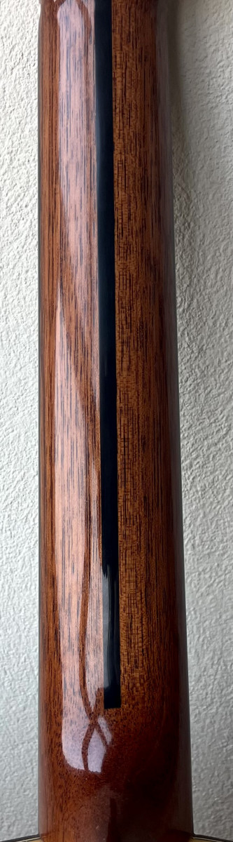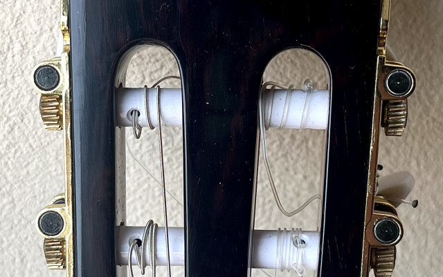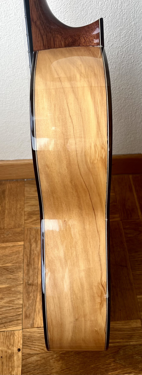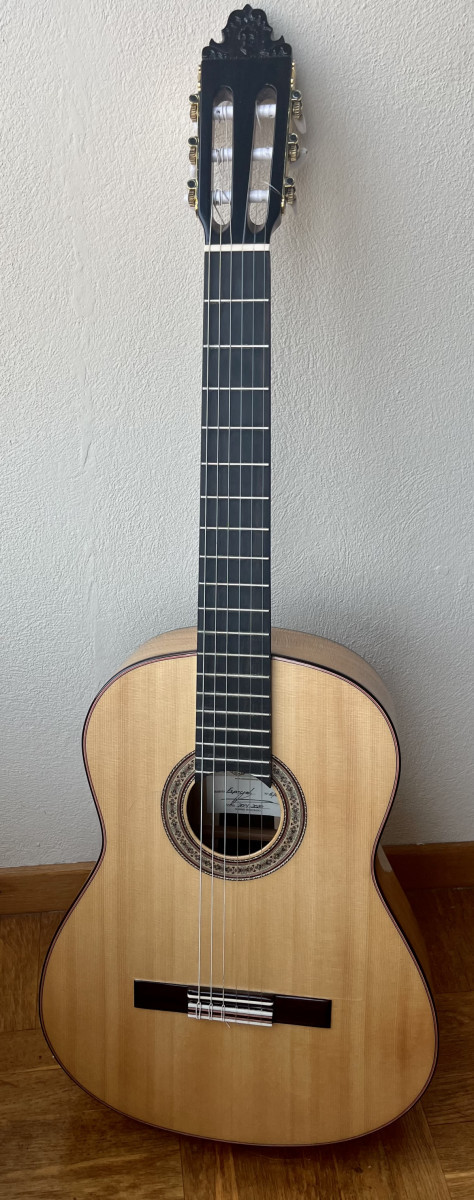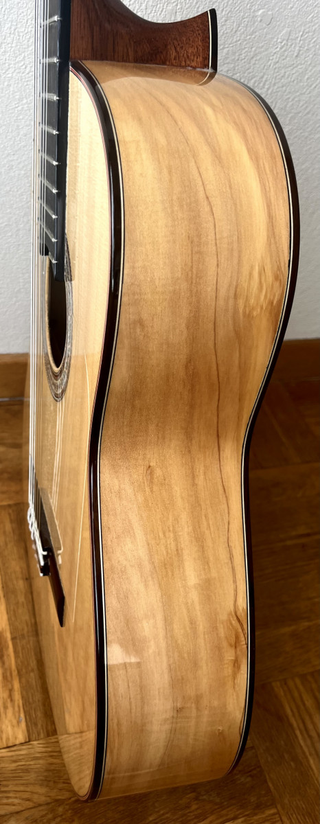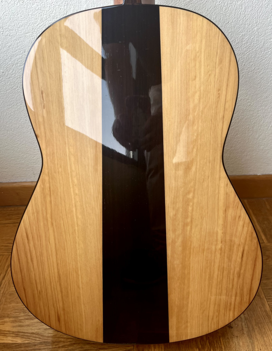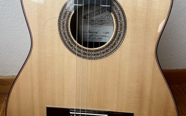 Esta guitarra tiene una preciosa tapa de pino abeto alemán con las vetas muy juntas y paralelas que tanto se valoran para el rebote del sonido en el flamenco, aros y fondo de ciprés español (podéis ver qué bonita es la veta de los aros) con una parte central trasera de palosanto de Río para darle un sonido más redondo. Diapasón de ébano y puente de palosanto de Río.