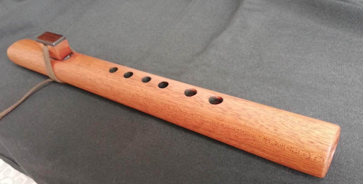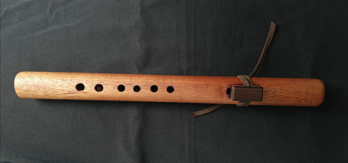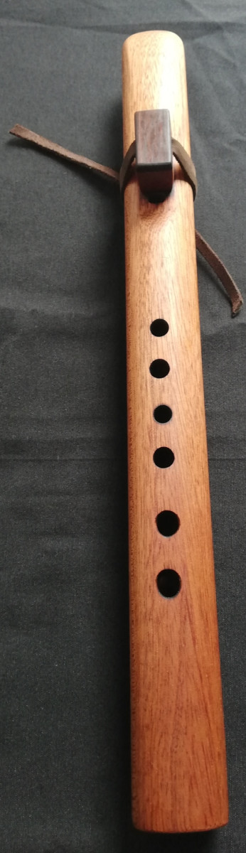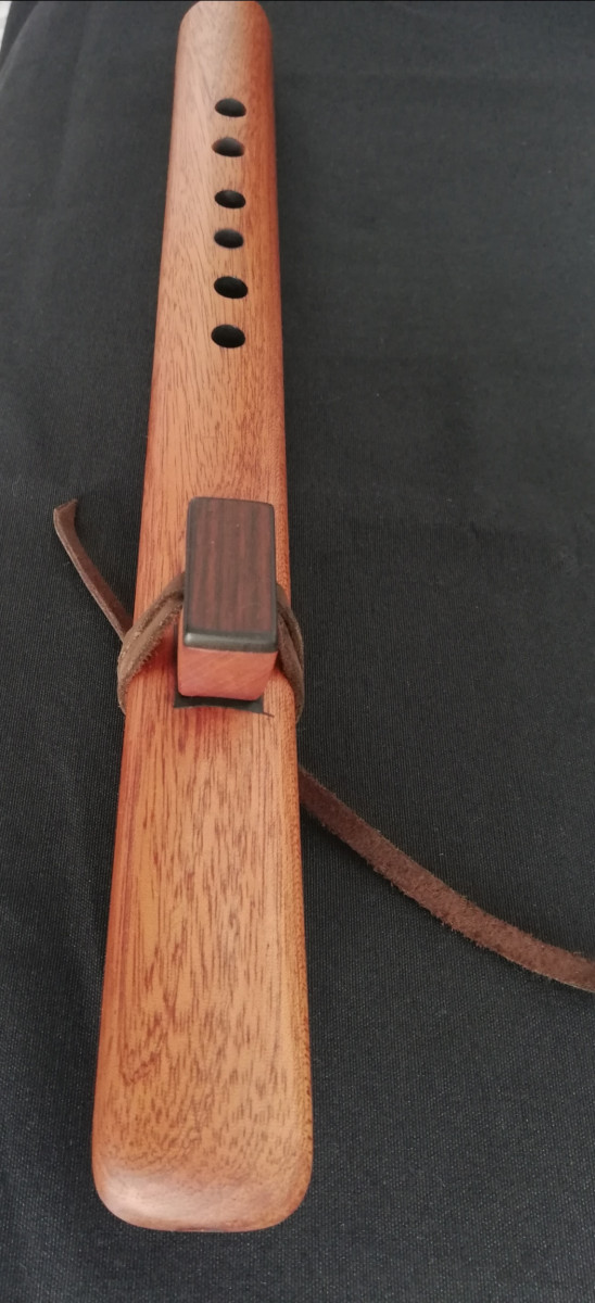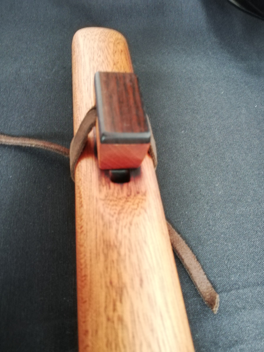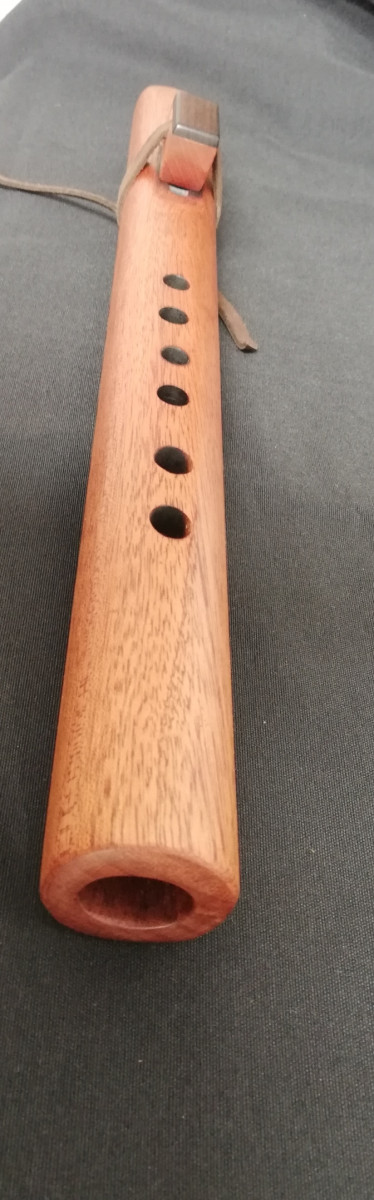 Flauta nativa americana en madera de caoba. Bloque de caoba con tapa de Palosanto. Lazo de cuero auténtico. Afinada inada en La menor 432hz.