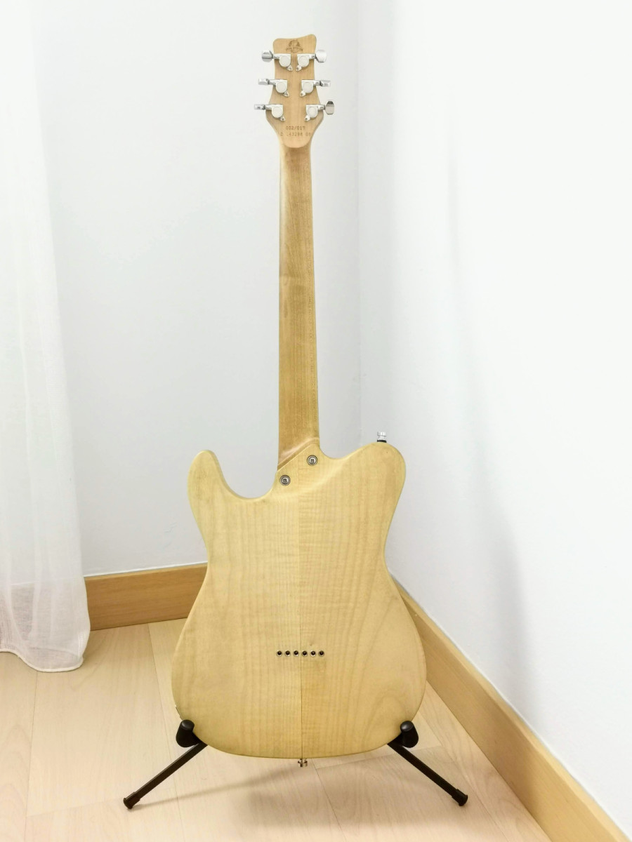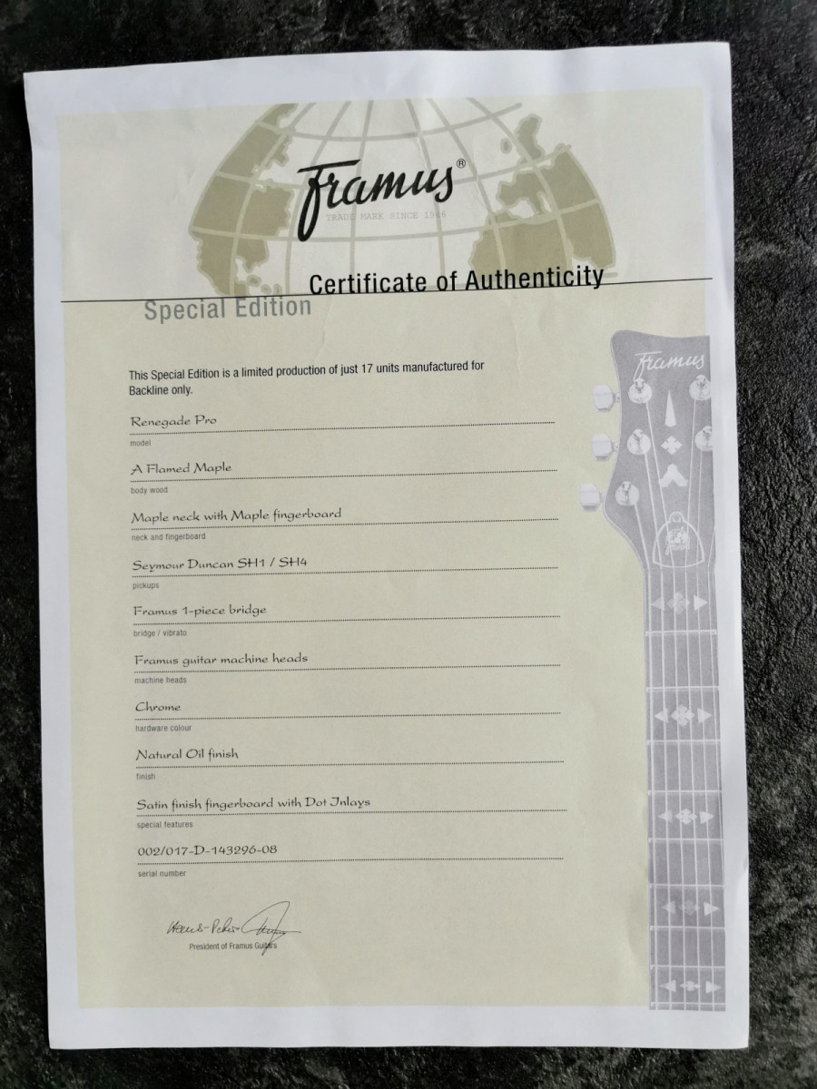 Calidad Framus alemana. Cuerpo y mástil de arce, pastillas Seymour Duncan, con selector de humbucker o single coil. Marcas de uso pero en perfecto estado, llevada por luthier. Con funda mochila original de la marca Rockbag. Sonido potente y sustain espectacular por el tipo de madera. Es la No 2 de un total de 17 ejemplares.
