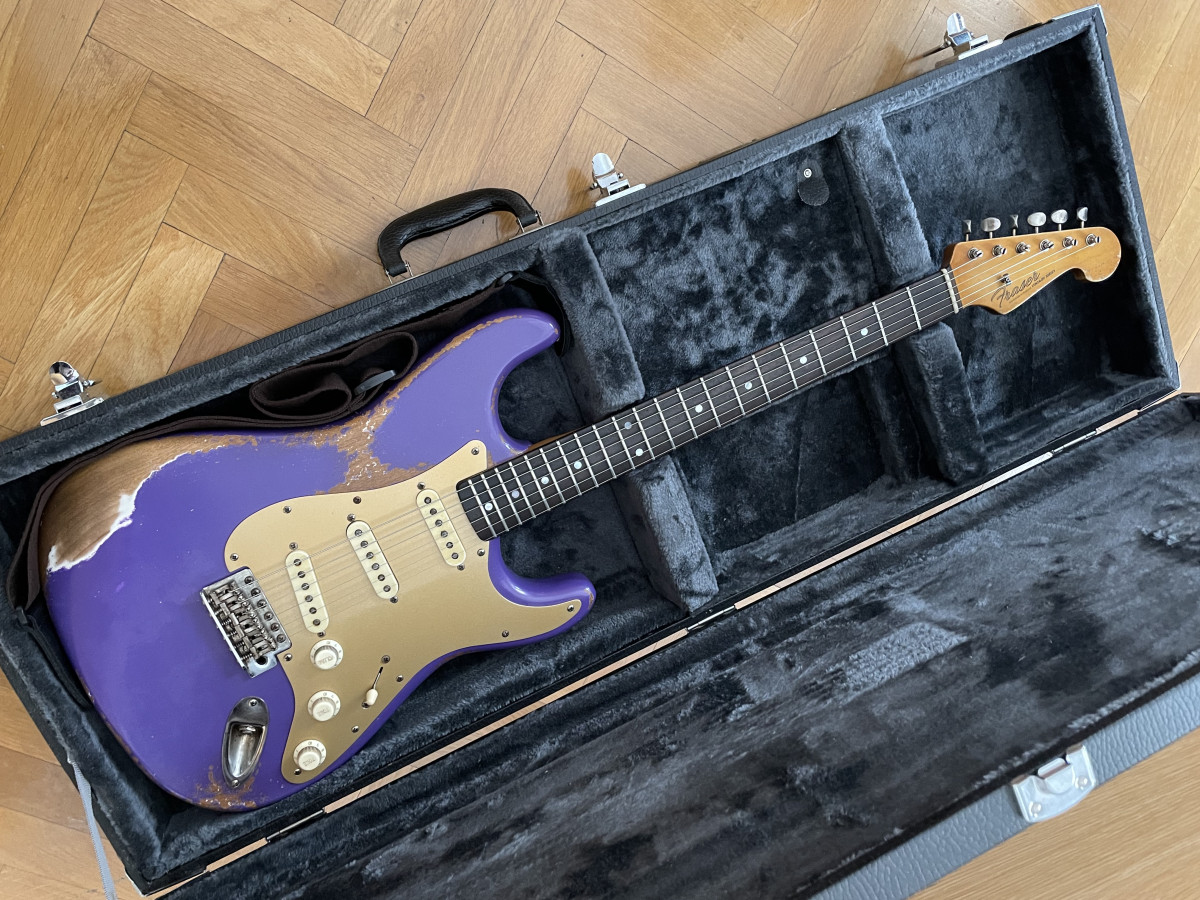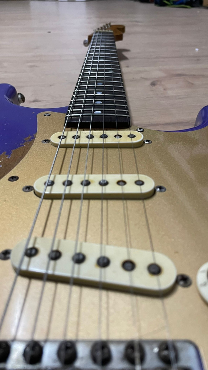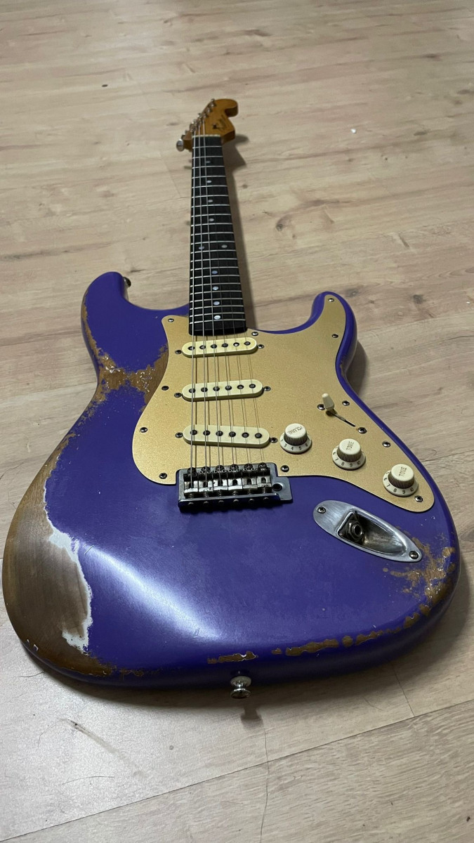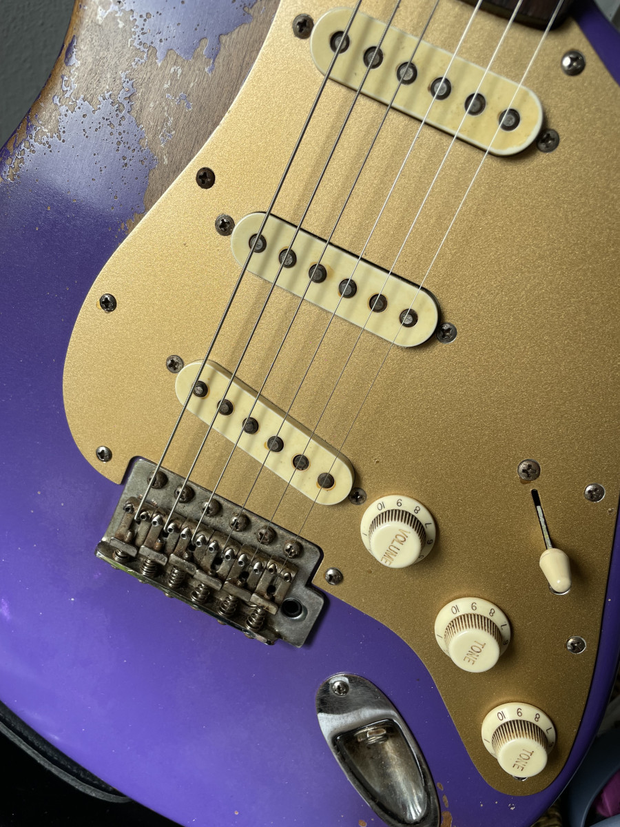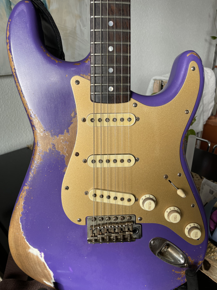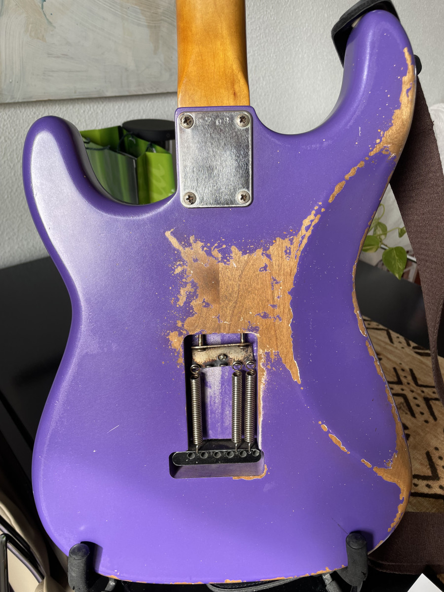 Mod. Vintage Series Purple Light Relic '60s S-Style, con un cuerpo de contorno profundo en aliso, acabado de laca de nitrocelulosa, diapasón de palo de rosa, golpeador y trémolo de aluminio dorado envejecido.