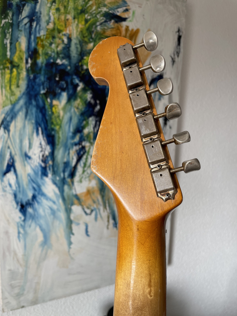 Mástil de arce Vintage "C" Redondeado, con diapasón de palisandro de radio de 9,5", trastes Vintage Jumbo laminados y pulidos, cejuela de hueso y clavijas de estilo vintage. Un trío de pastillas de bobina simple de los años 60, bobinadas a mano según especificaciones vintage con pastilla central de polaridad inversa/bobinado inverso, garantiza que esta guitarra conserve el sonido clásico de la época. Con estuche rígido.