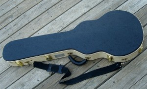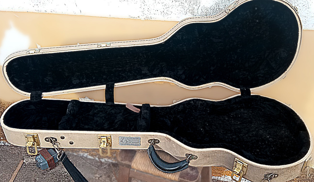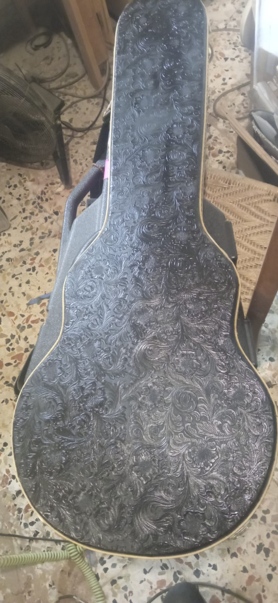 Funda para guitarra electrica tipo Les Paul, con exterior de cuero imitacion trabajado en estilo 'cowboy', hecho especial para me por Tom Dougherty dueño de Cedar Creek y TKL, Calidad es la famosa Cedar Creek, interior negro exterior negro/color crema. Hay solo 1 de estos en el mundo entero.
