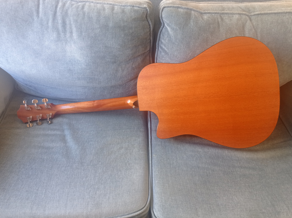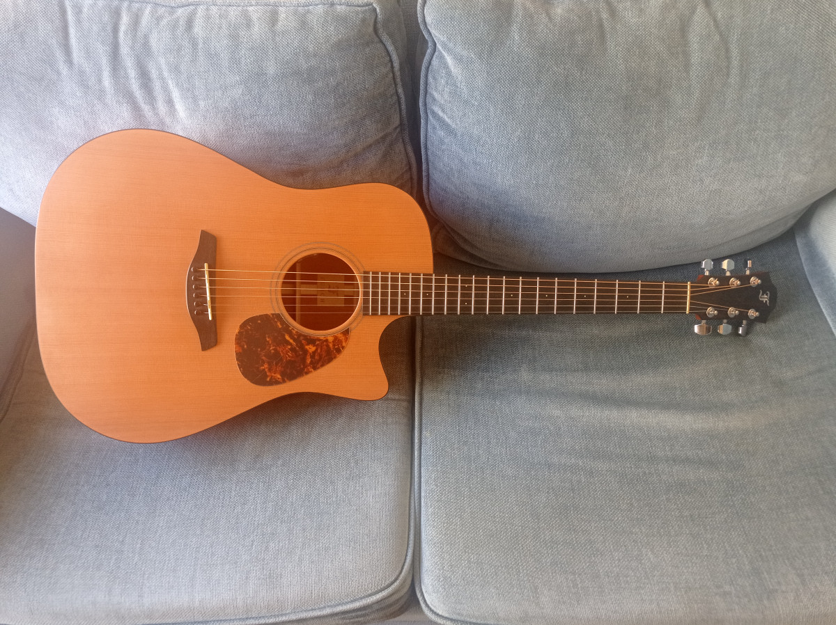 Dreadnought electroacústica con cutaway de calidad profesional. Entera maciza. Tapa cedro, fondo/mástil caoba africana, diapasón/puente/pins ébano. Clavijas Furch (van estupendas). Incorpora mejoras desarrolladas por este fabricante: Tapa afinada individualmente, barniz a poro abierto, sistema CNR de ajuste del alma y encaje en el zoque....Cejuela 45mm. Bordón a 22mm en traste 12 y prima a 20mm.