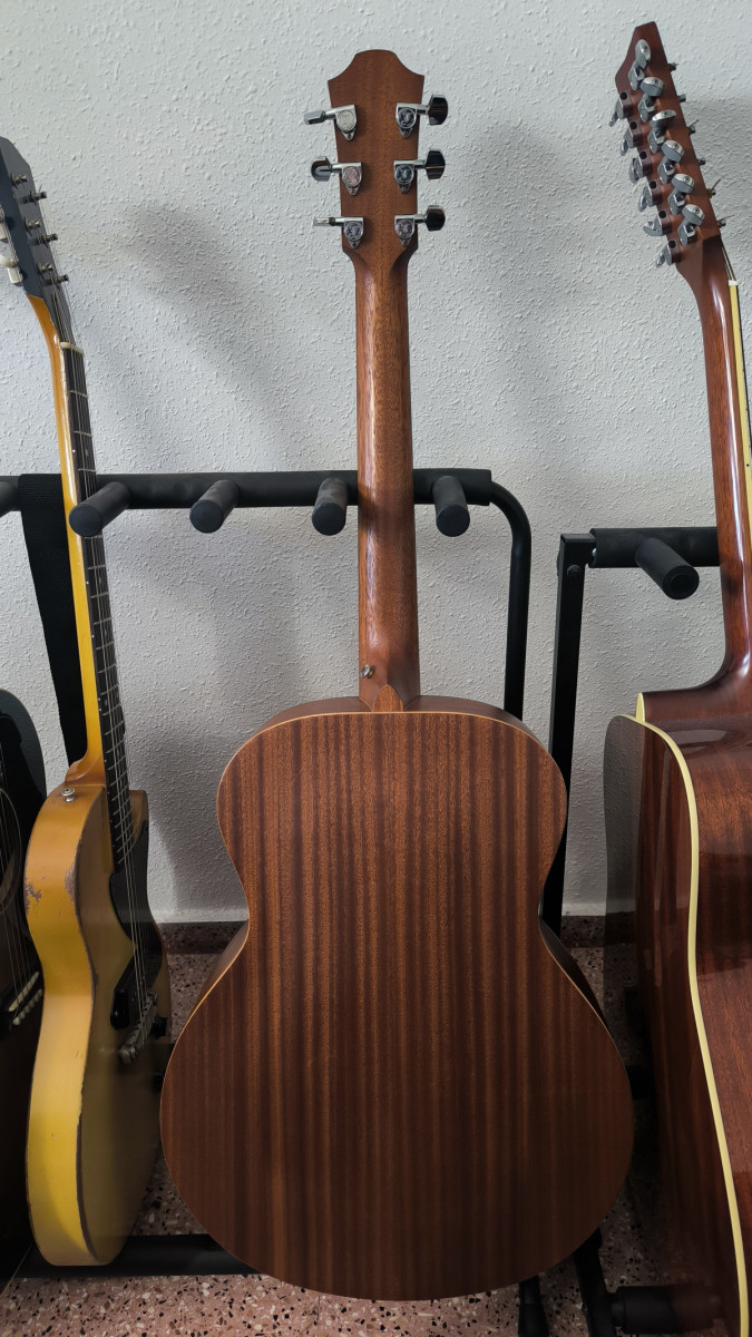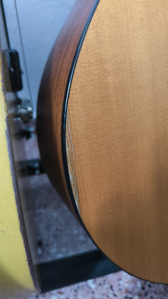 Es una guitarra de tapa sólida de sitka, aros y fondo de caoba laminada, mástil de caoba y diapasón y cara del clavijero de ébano. Las maderas son de muy buena calidad, seleccionadas, los que conocéis Furch sabéis qué calidad de maderas tiene esta marca. Tiene un toque en la tapa que muestro en la foto 3 y un desgaste del apoyo del brazo en la foto 4. Solo son toques estéticos, no afecta a la estructura ni al sonido.