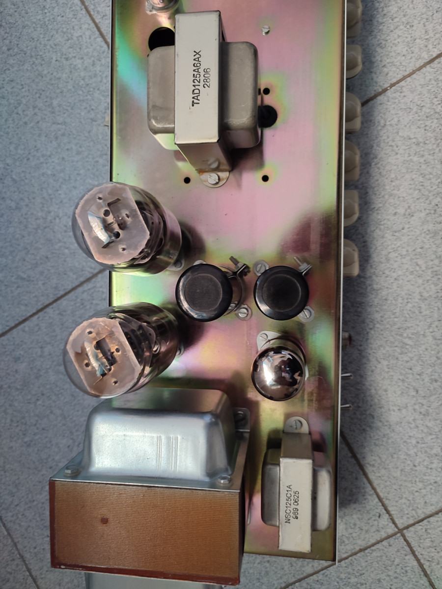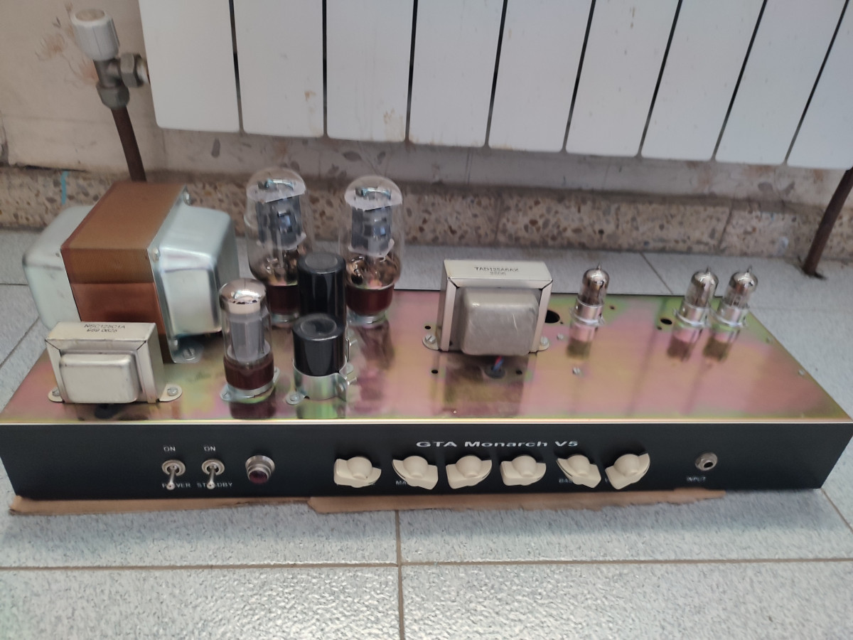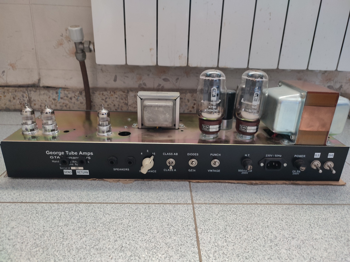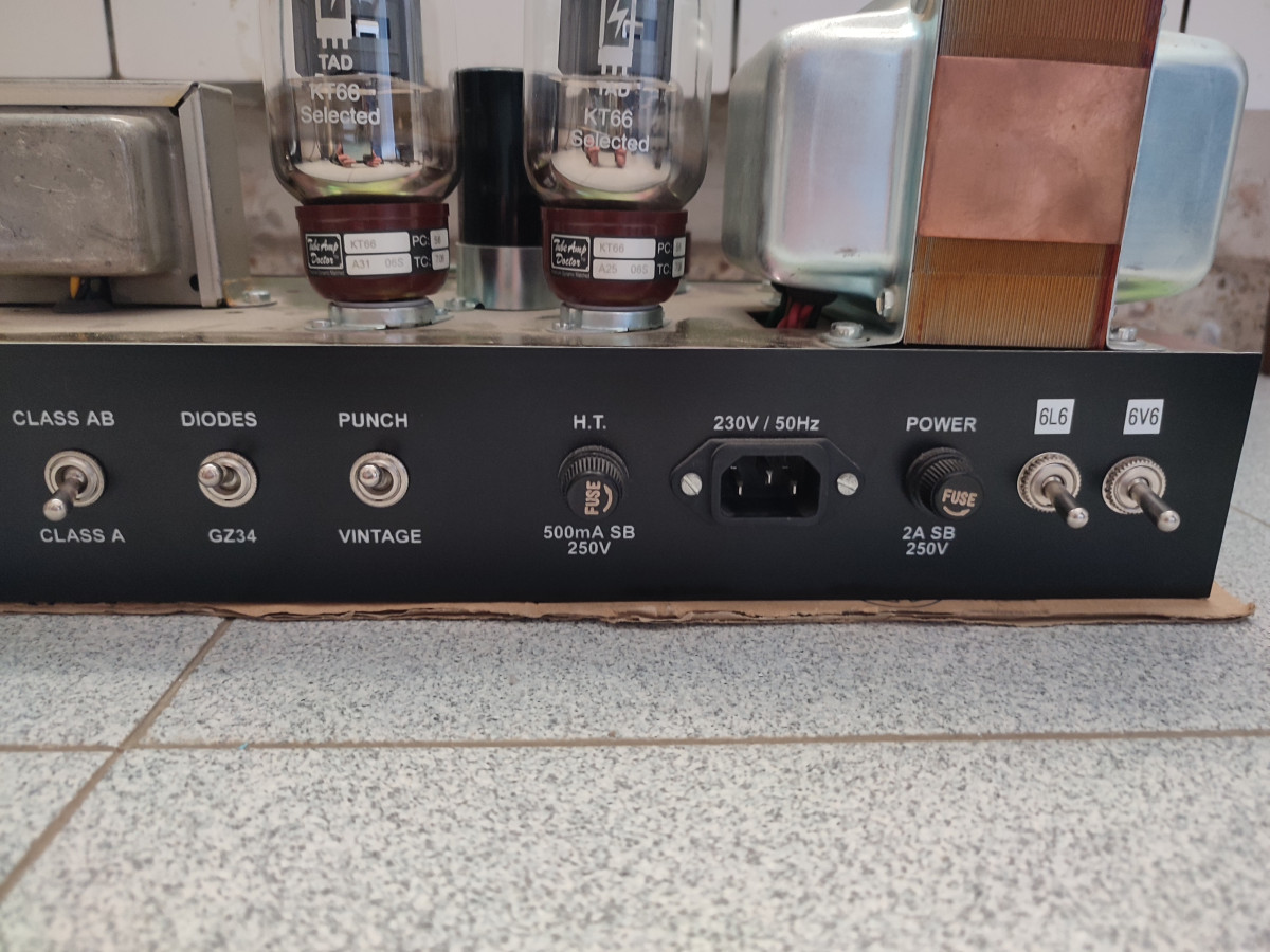Este ampli trabaja de serie con kt66, añadí también un selector para poder trabajar con 6l6 lo que fenderiza bastante su sonido sobre todo con la rectificadora, y un segundo selector para trabajar con 6v6, lo mismo, sonido tweed muy agradable. Todas las valvulas son TAD. Modificaciones realizadas por Masteraudio de Zaragoza.