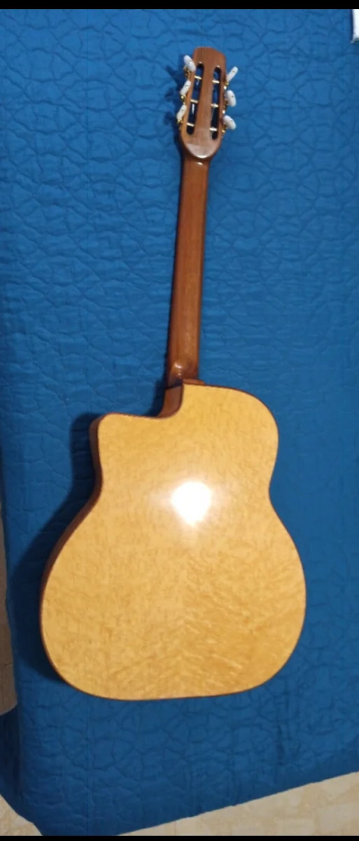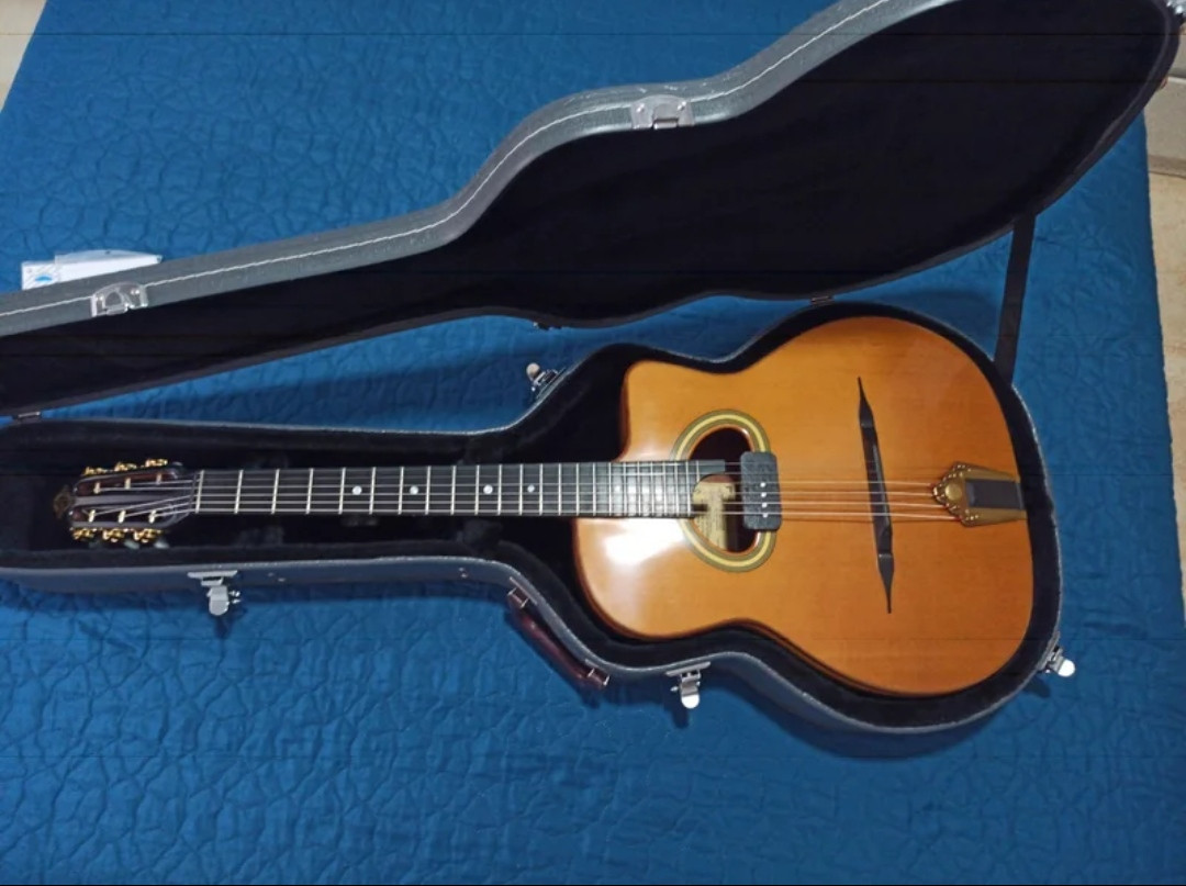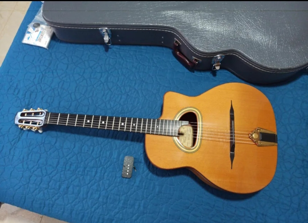 Guitarra artesanal para Gipsy Jazz o Manouche Gerónimo Mateos. Año 2016. Perfecto estado,no tiene ni un roce. Pastilla hecha por el fabricante a medida y con instalación del cableado por dentro, lleva el jack por donde se engancha la correa. Nada que decir, busca en la web si no conoces este luthier, este modelo ya no se hace. Máxima calidad hecha a mano. Nada mas que la pastilla ya me costó 350€ y está sin estrenar. Se la compré a Javier Sánchez en 2017 y el la tenia un año mas o menos. Asi que si encontrais algún video de Menil Swing del 2016 escuchareis como suena. La compré , la llevé a que le instalaran la pastilla y desde entonces no ha salido de mi casa. Si queréis mas fotos o de mas calidad pedirlas y por supuesto se puede probar sin problema. No cambio ni rebajo, por favor no insistáis.