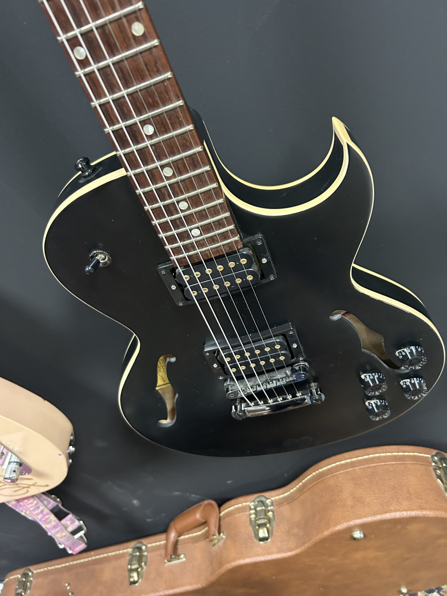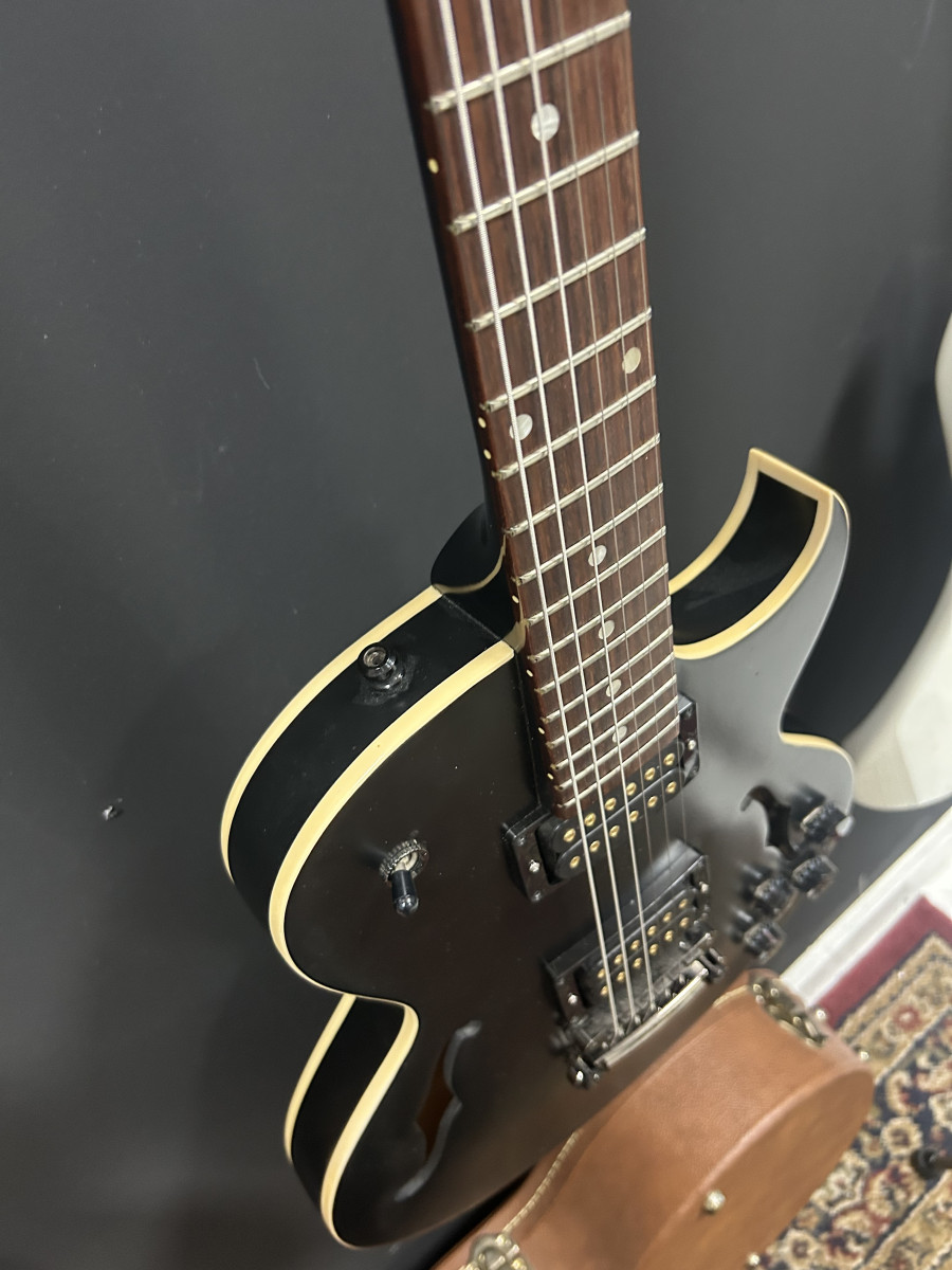Esta lleva pastillas Aldi meola ,es negro mate y lleva doble sistema de pin para correa (puedes colgarla como una sg o como una les Paul )