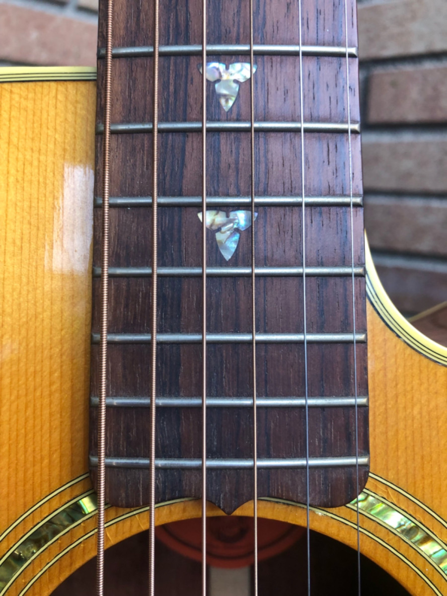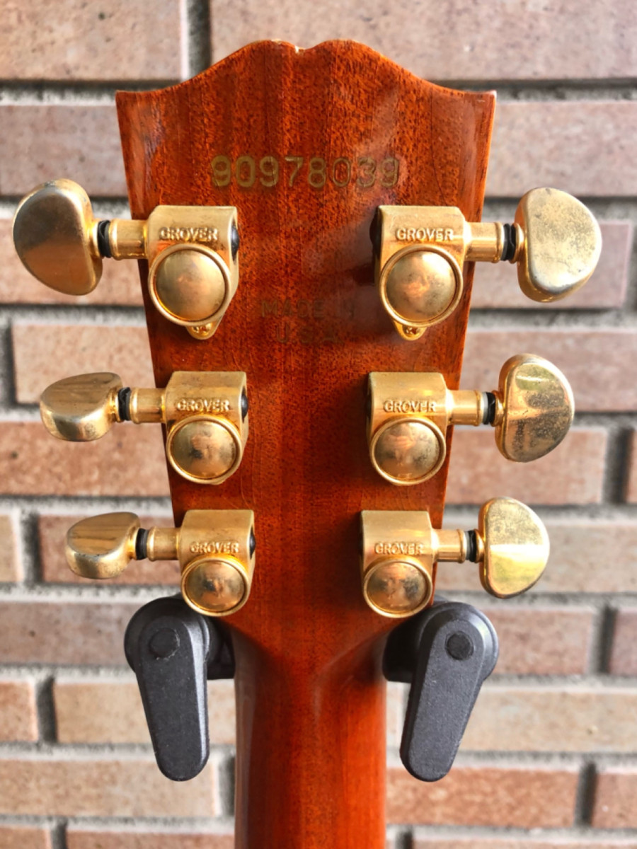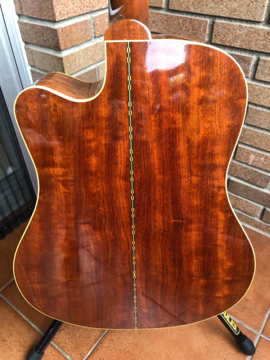 maderas de primera calidad, abeto macizo en la tapa y bubinga maciza en aros y fondo. mástil de una pieza de caoba con una veta rectisima modelo en el que se baso el actual songwriter.
