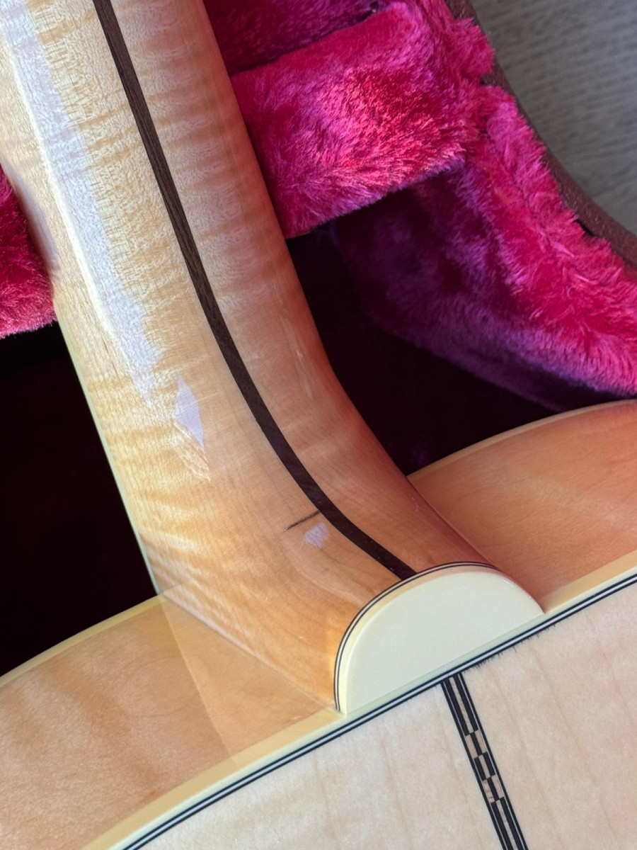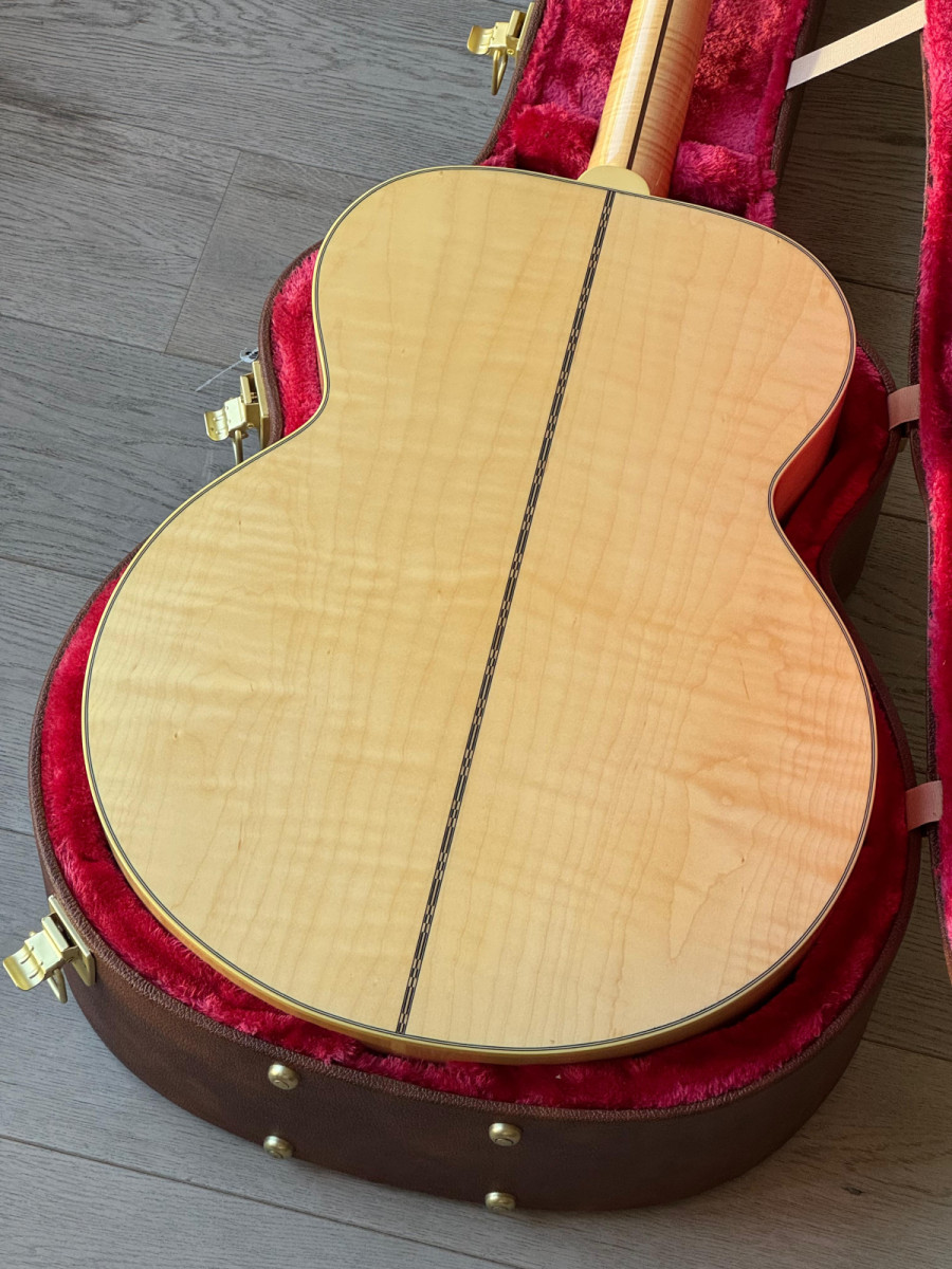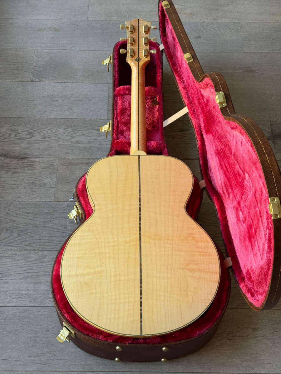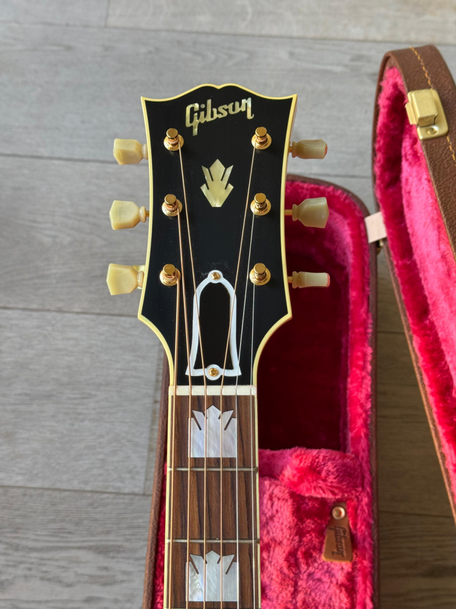 Una guitarra acústica de alta gama fabricada por la Custom Shop de Gibson, completamente diferente al modelo estándar de USA. Esta pieza exclusiva destaca por su tapa de Red Spruce (Adirondack) y sus aros y fondo de arce flameado, ofreciendo un sonido rico, equilibrado y poderoso.