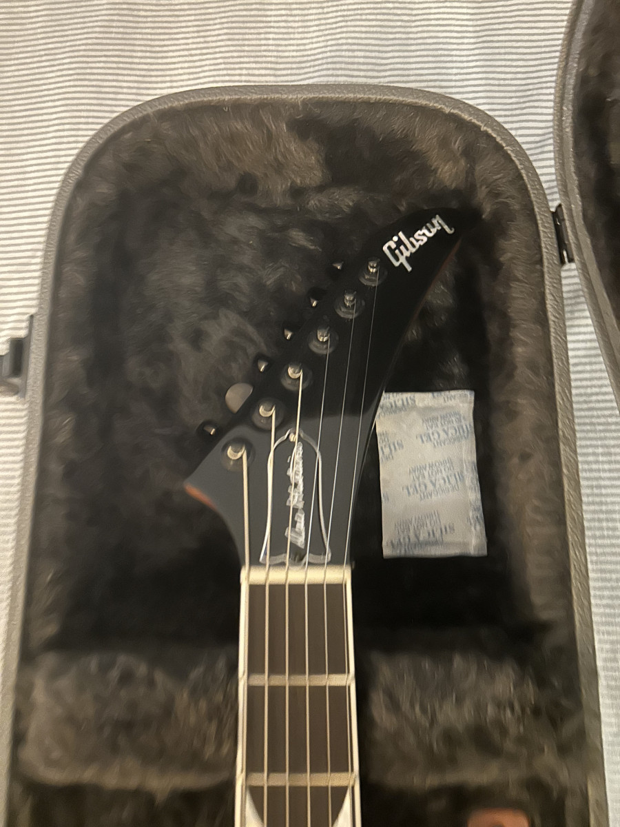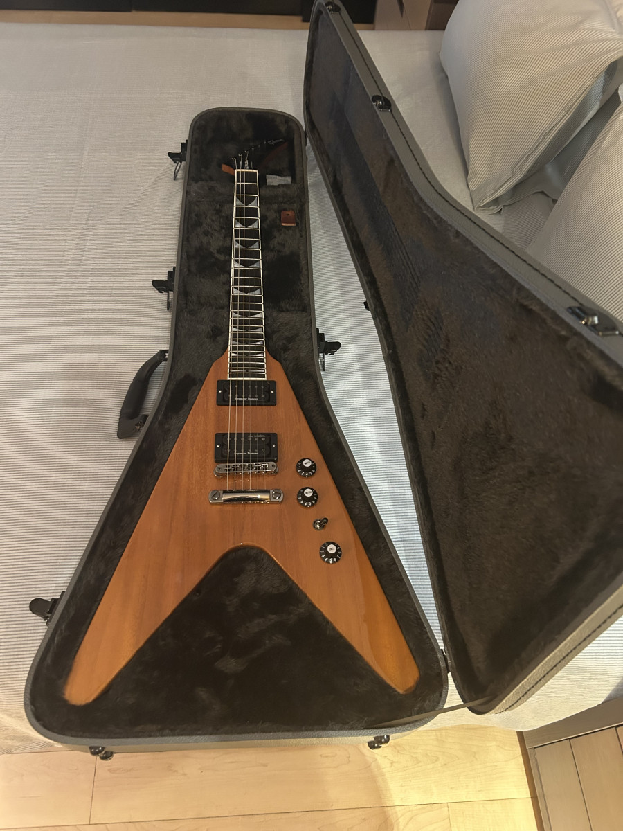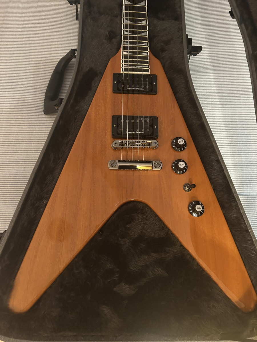 Gibson Dave Mustaine Flying V EXP Antique Natural. Comprada el 1 de Abril de 2025, con factura de tienda y garantía de tres años. La vendo porque no me hago con la forma de flecha simplemente. Está descatalogada ya, no parece que Gibson las vuelva a fabricar. Actualmente el precio de las pocas que quedan en tiendas es de 2299€. Es difícil ya encontrar.