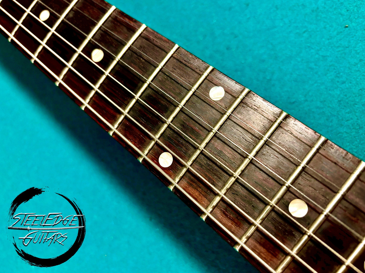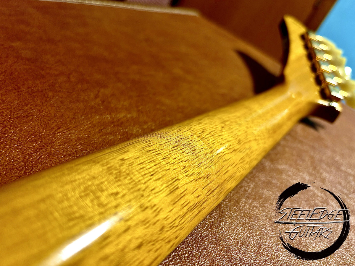 Aparte del grano y la veta de la korina, el chocolateado del diapasón de palorrosa, con un grano increible, la hace una guitarra de exposición y una buena inversión.