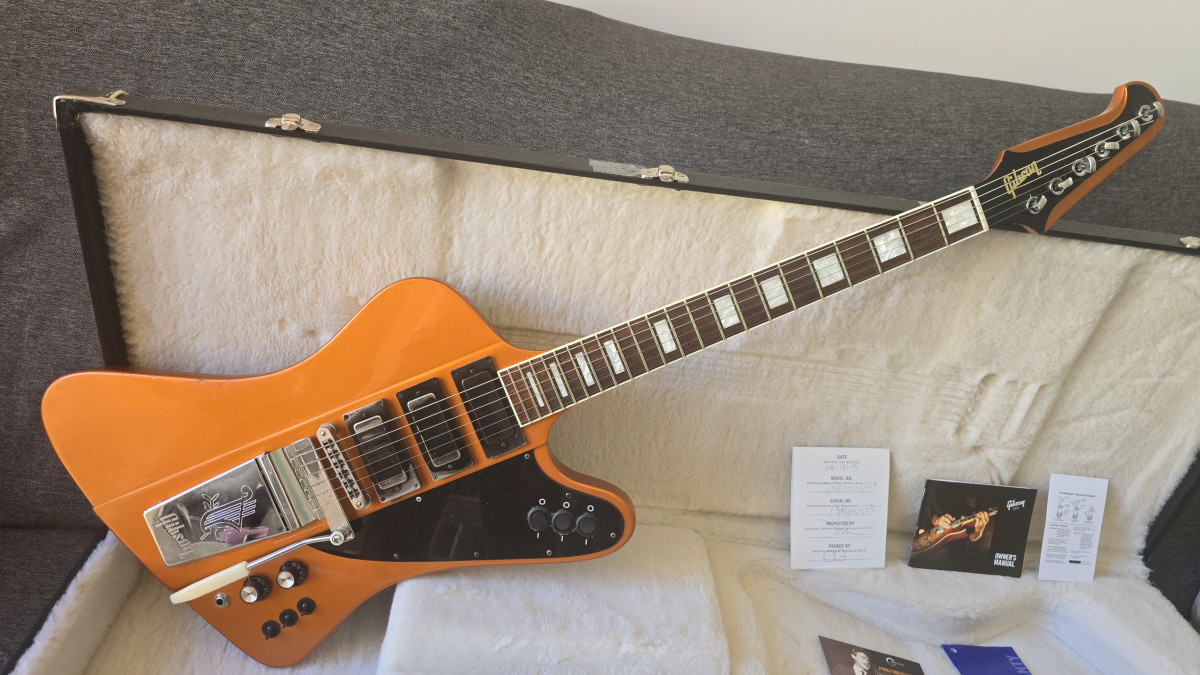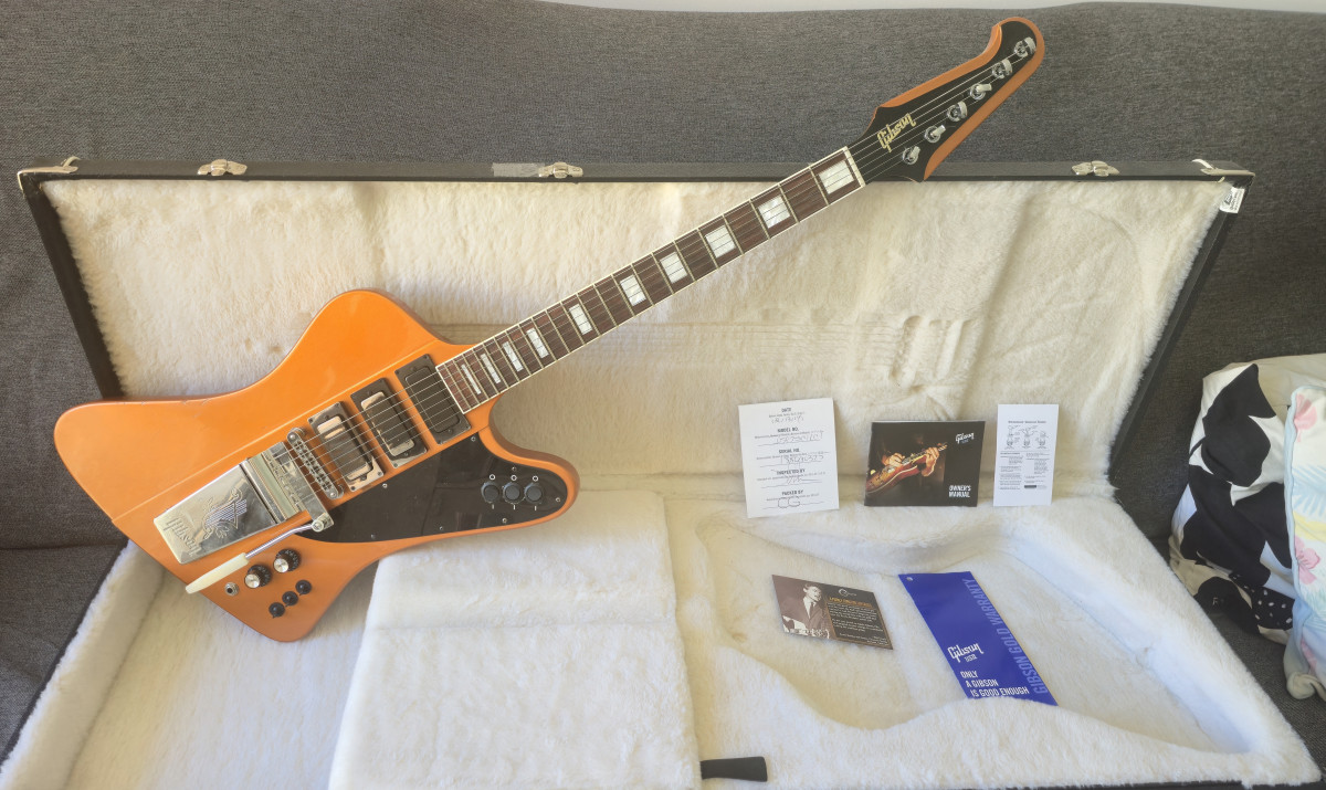 * Plásticos: Pickguard negro con la inscripción del pájaro Firebird.