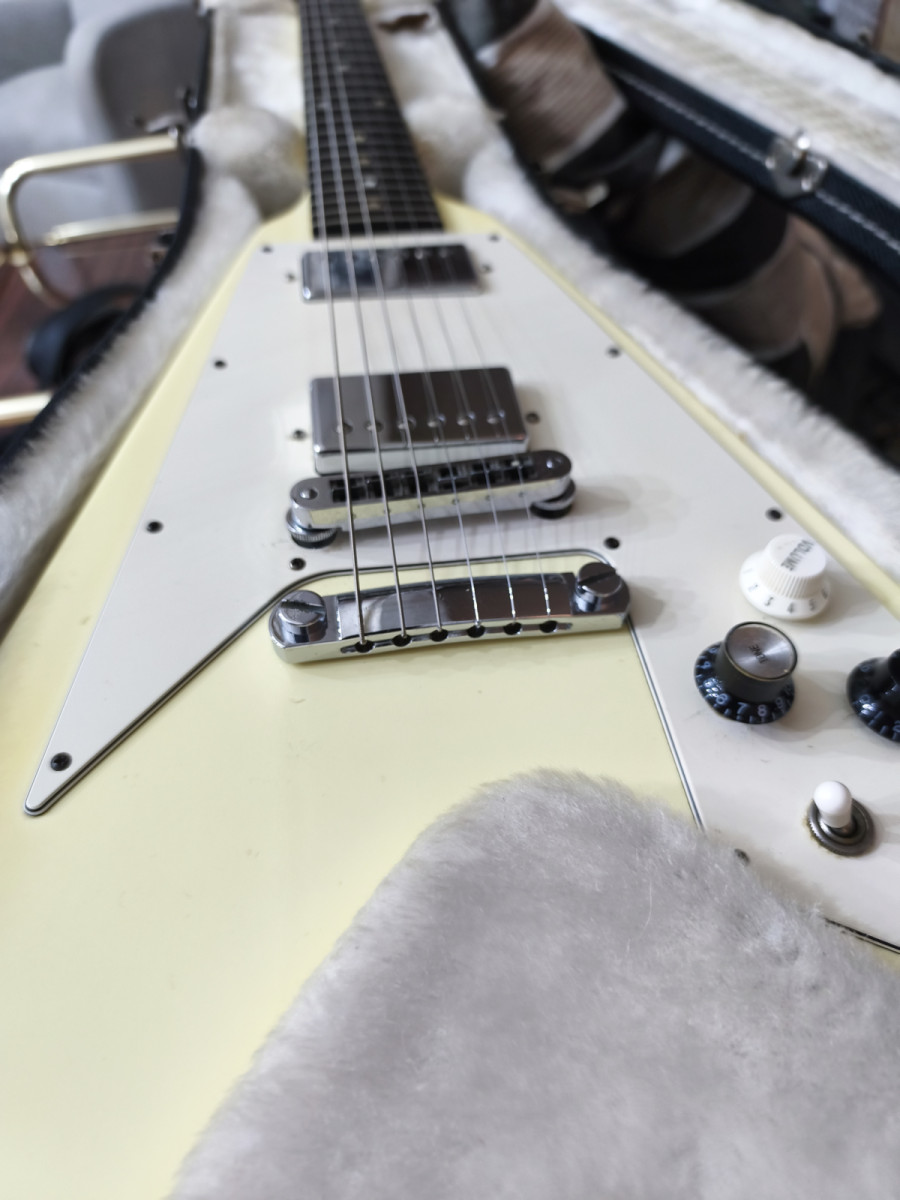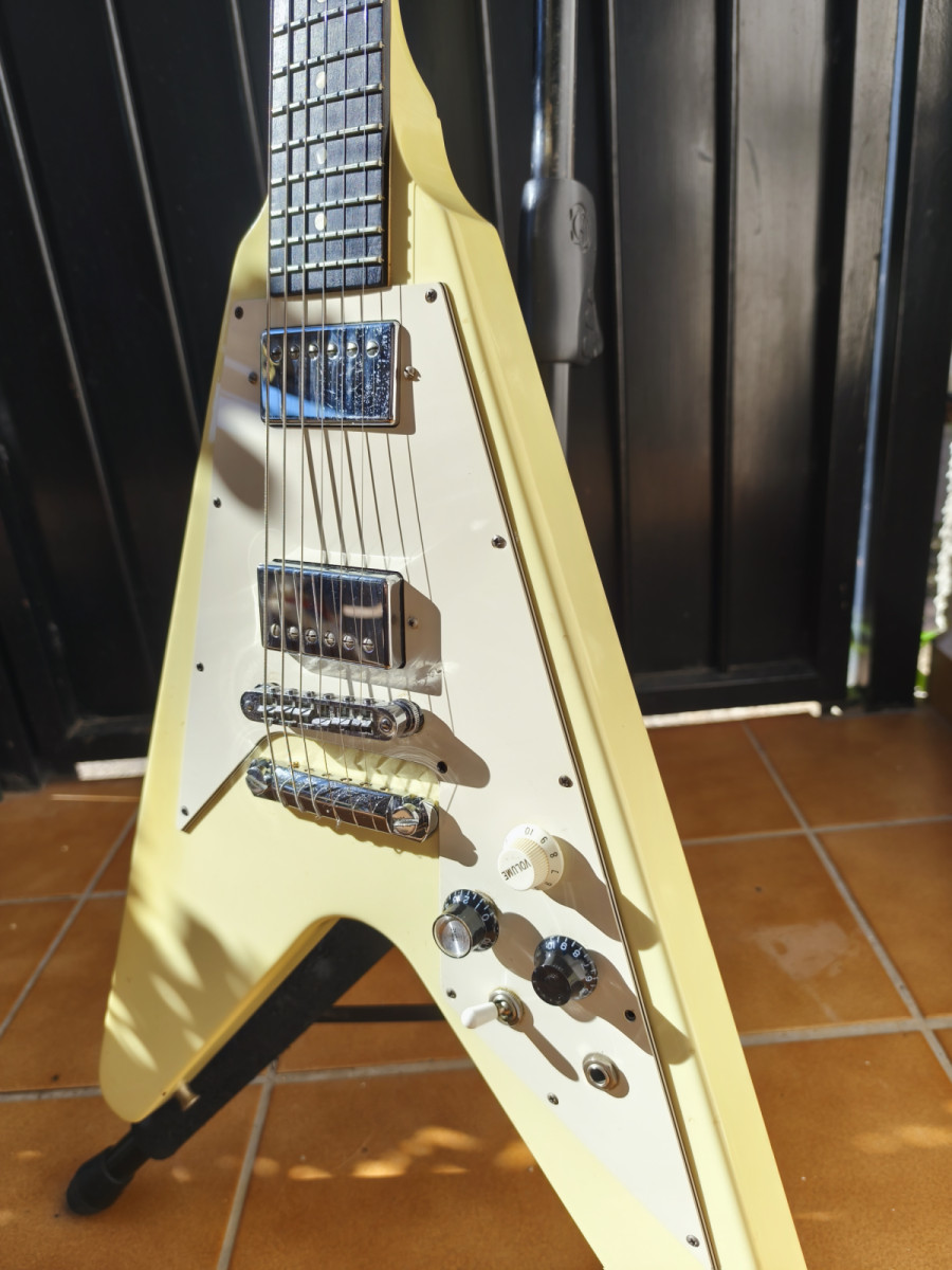Soy el único propietario, comprada en Casa Martí en 2011. Si no me equivoco, fue el último año en que se fabricó esta guitarra con el acabado mítico, que luego ha vendido Gibson como "Flying V 71".