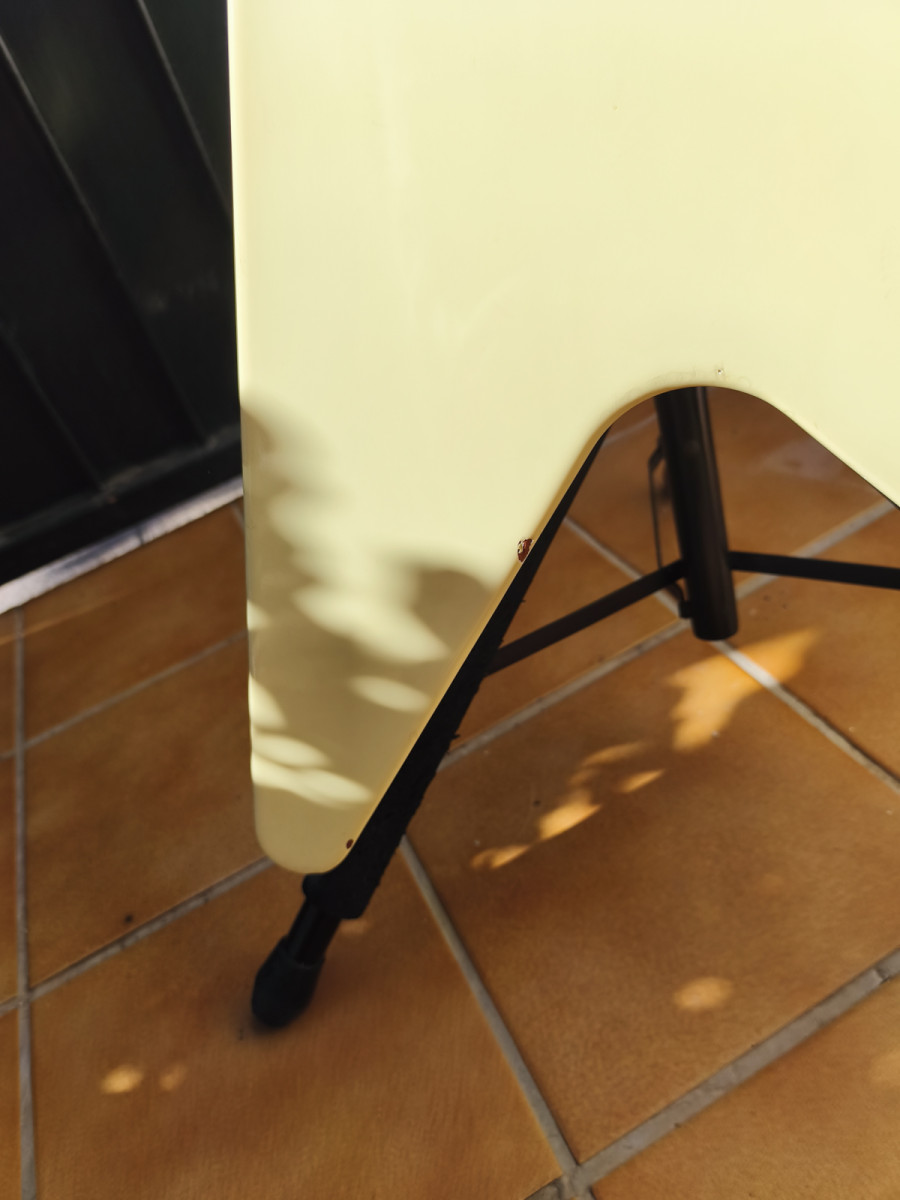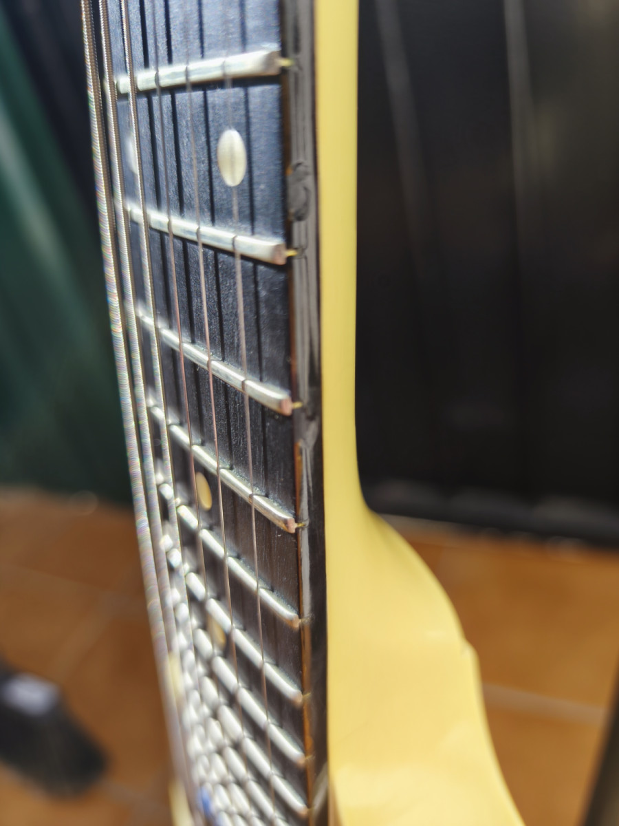 Tiene evidentes marcas de uso, lógicas en cualquier guitarra de flecha y un ding detrás del mástil. No obstante , ha sido muy cuidada siempre. Trastes y diapasón en perfecto estado. Acción bajísima sin trasteos una resonancia bestial.
