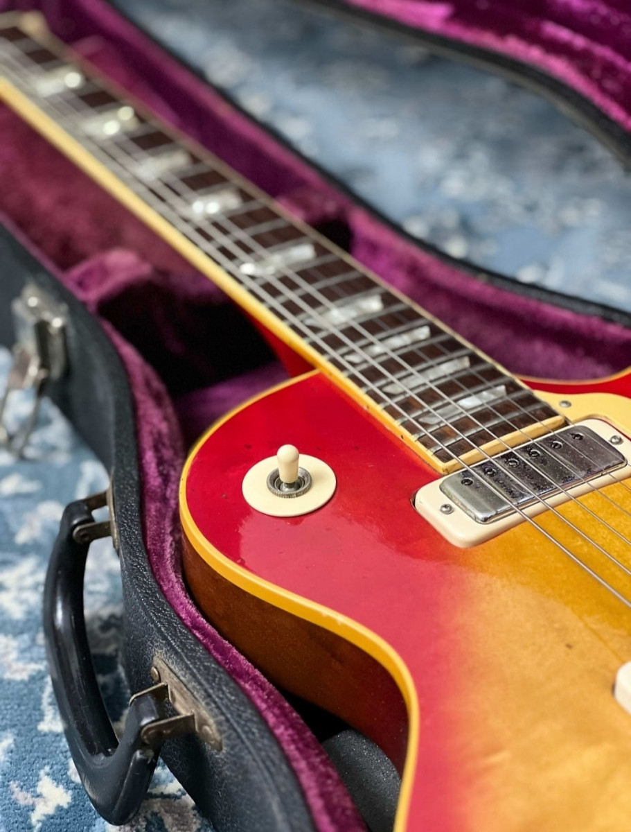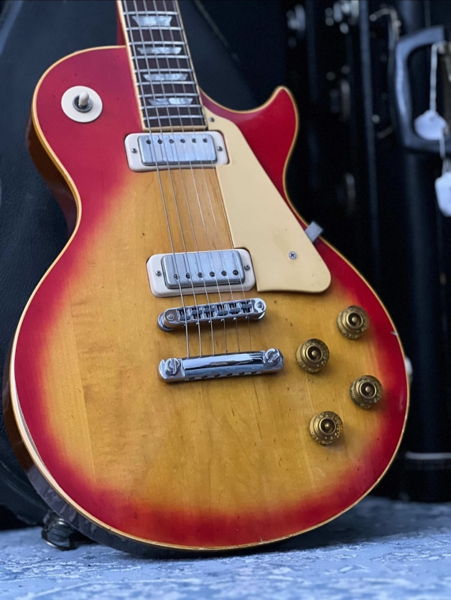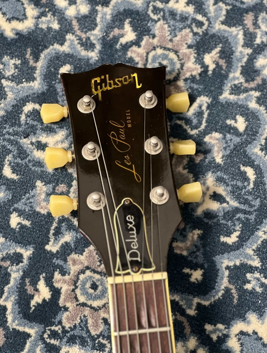 Sobre la guitarra pues es una Gibson Deluxe 1979 Cherry Sunburst toda original, (excepto los clavijeros que son unos Schaller de la época, los originales son los "Flower") con el estuche más alto de gama también de la época. Cómo dato para el que no lo sepa. En aquel momento las guitarras venían sin estuche y se podían encargar aparte. Habia tres modelos con diferencias en el color del terciopelo, luego salieron los estuches Chainsaw que son los típicos que veréis, mí guitarra lleva el más alto de gama, y a día de hoy solo el estuche cuesta un buen pellizco, sobre los 500/600€ en eBay y Reverb que es donde únicamente lo váis a encontrar.