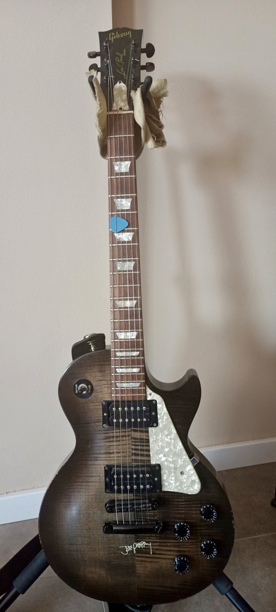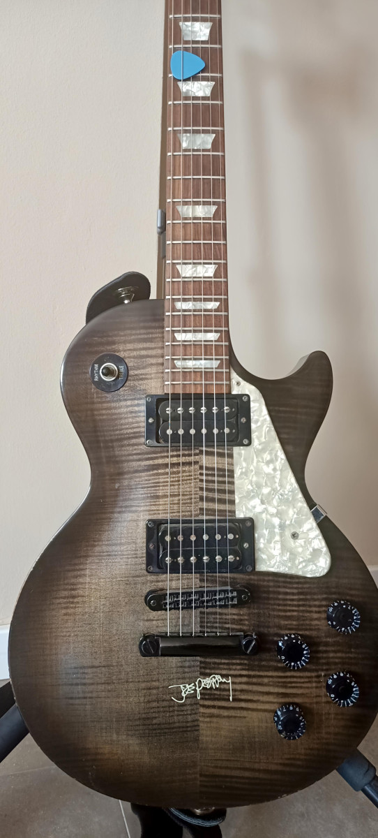 Gibson Joe Perry Signature Les Paul de 1997. Un modelo Signature realmente genial de una época en la que Gibson no fabricaba guitarras Signature a diario, acabado Translucent Blackburst, una hermosa tapa de arce flameado, pastillas 57 Classic en el mástil y una humbucker Joe Perry Custom wound en el puente.