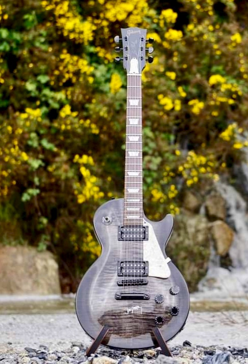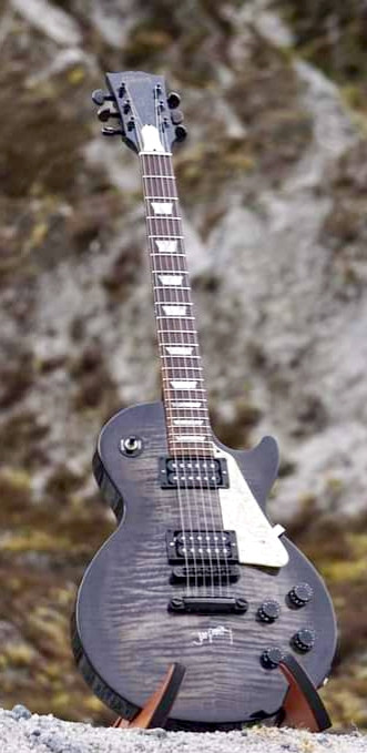 Material y detalles del cuerpo: Cuerpo de caoba maciza con tapa de arce flameado tallado.